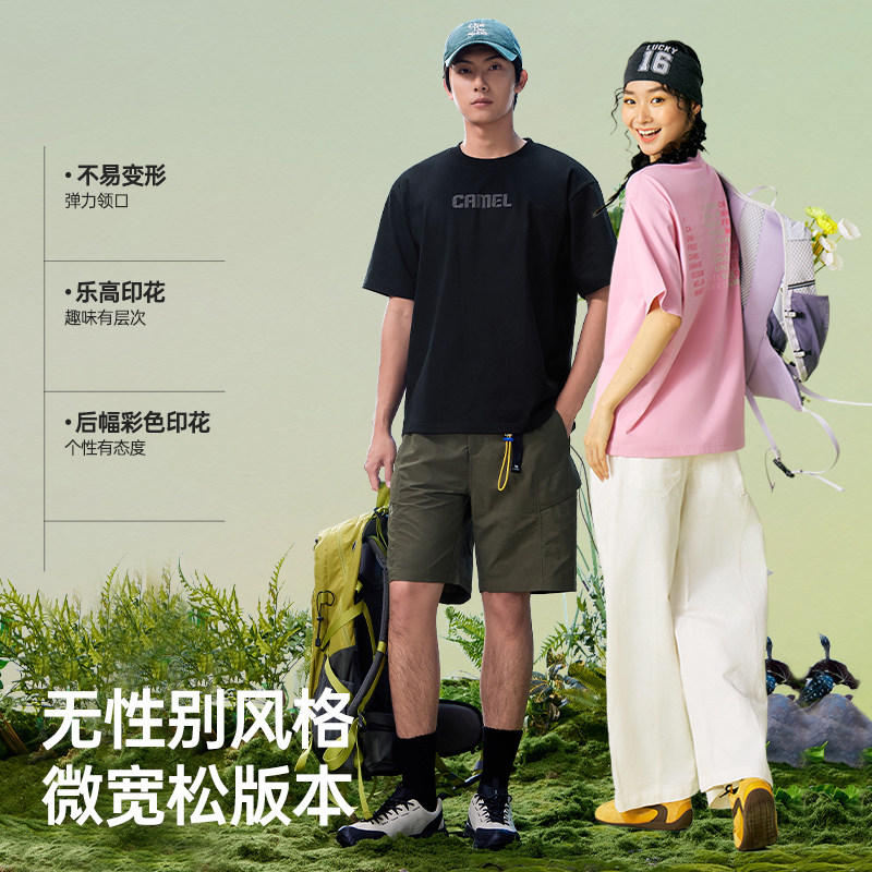 骆驼女装T恤2026春季新款圆领微阔防晒运动上衣印花抗菌透气短袖
