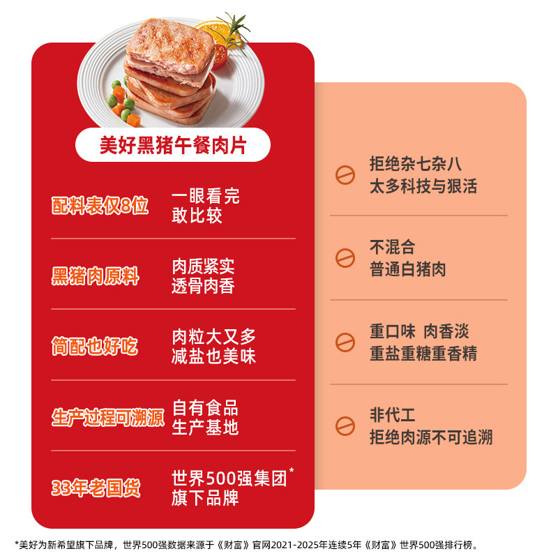 美好黑猪午餐肉240g独立包装汉堡三明治火腿即食猪肉片装减盐早餐