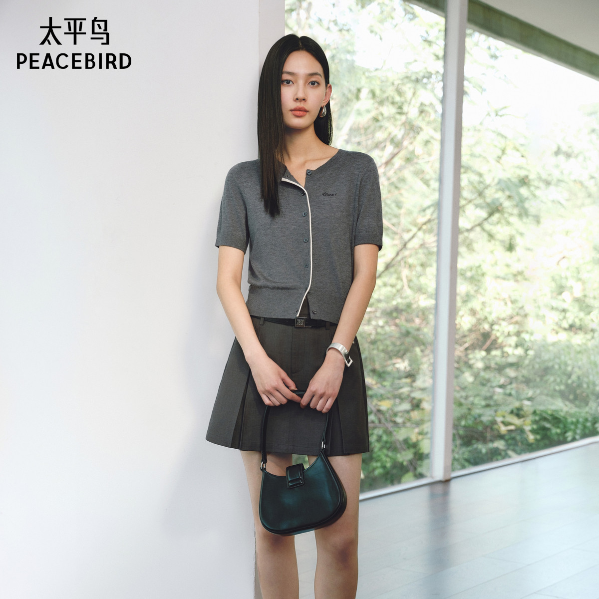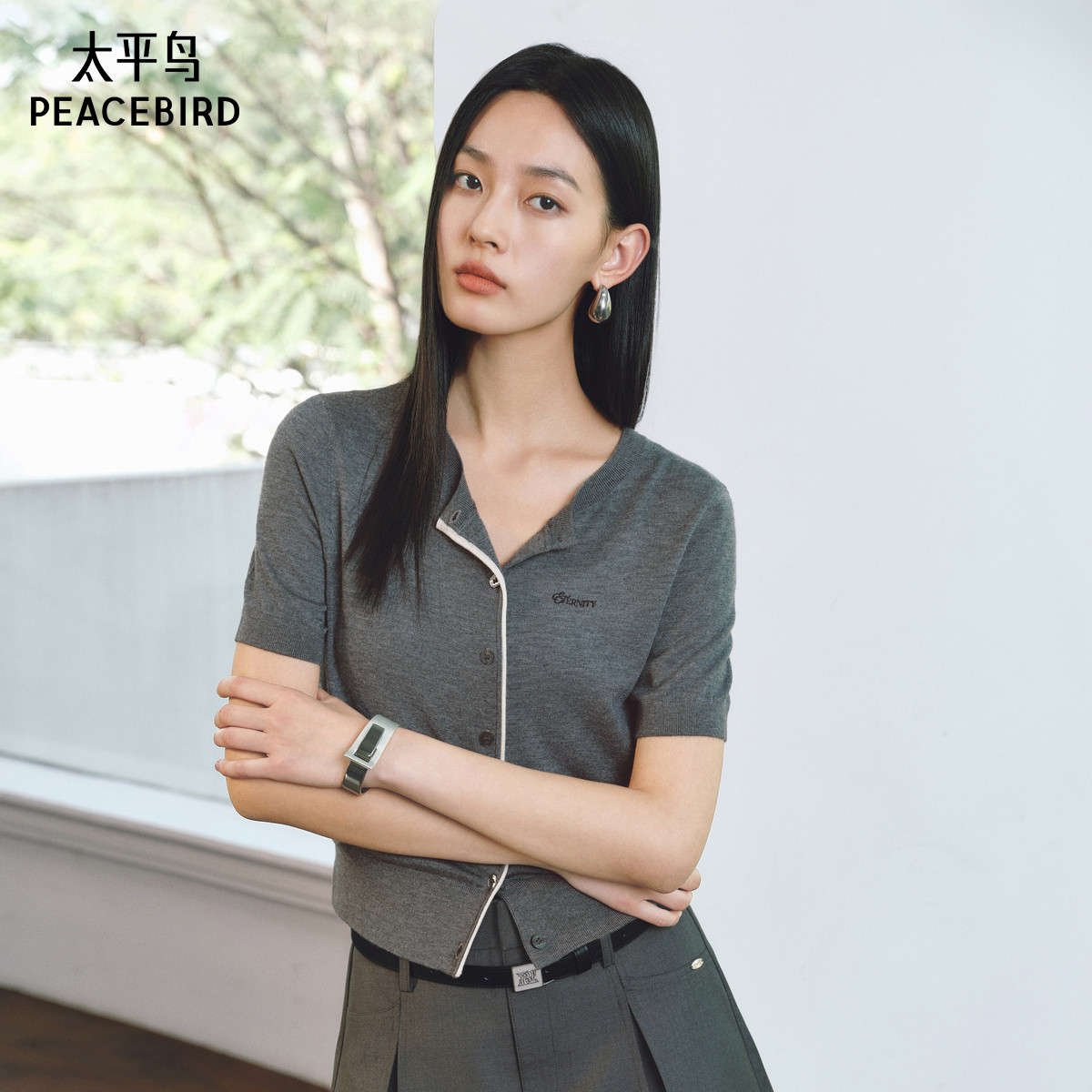 太平鸟桑蚕丝羊毛混纺针织开衫25夏季女士新款门襟撞色老钱风上衣