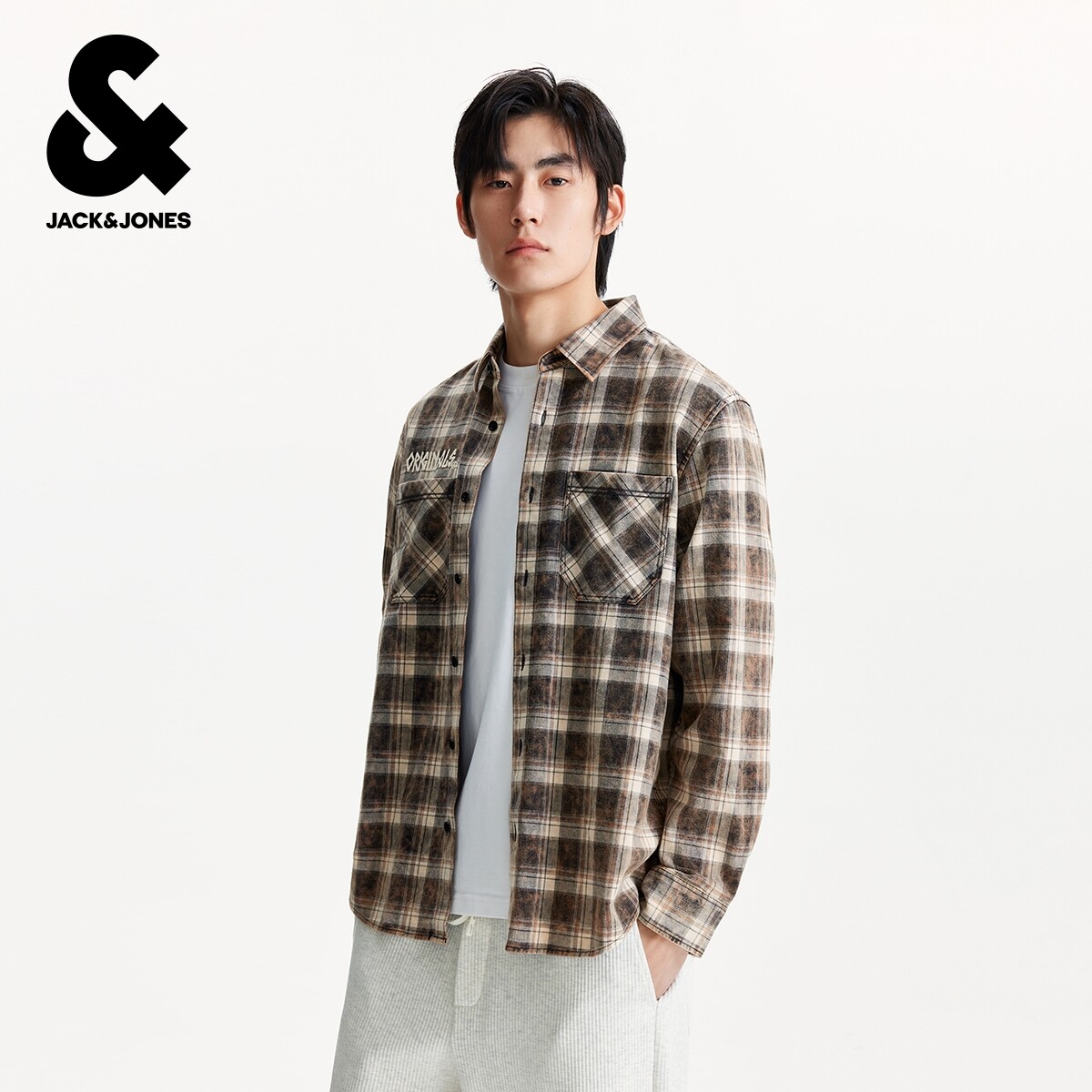 杰克琼斯男装衬衫春季时尚格纹字母刺绣全棉翻领款宽松长袖上衣