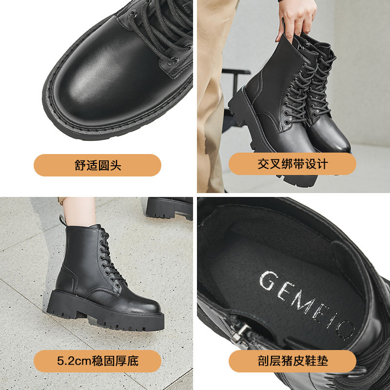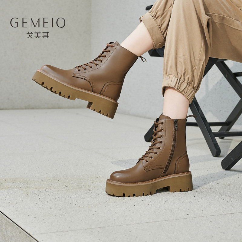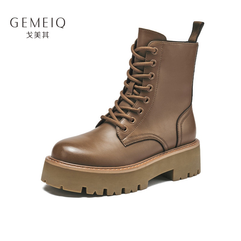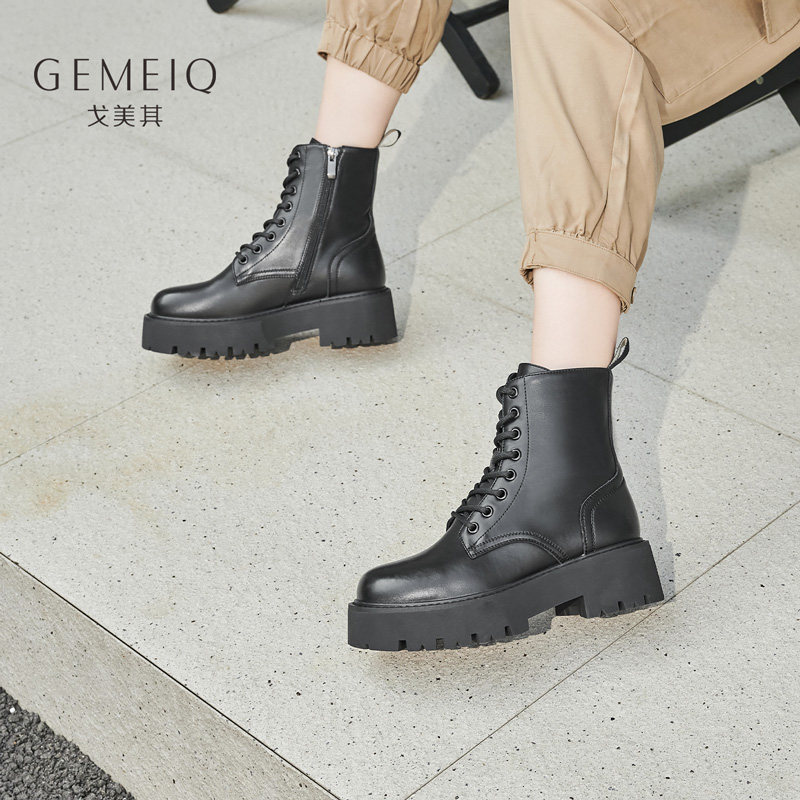 戈美其真皮厚底马丁靴女2024年新款英伦风八孔冬季高跟粗跟短靴子