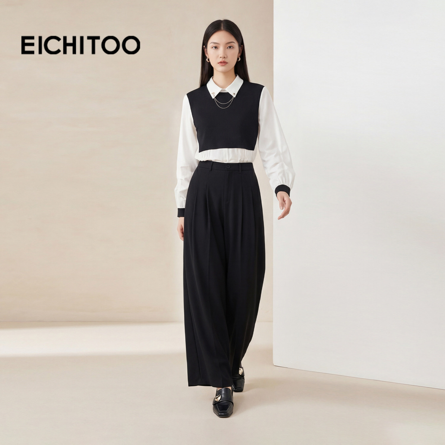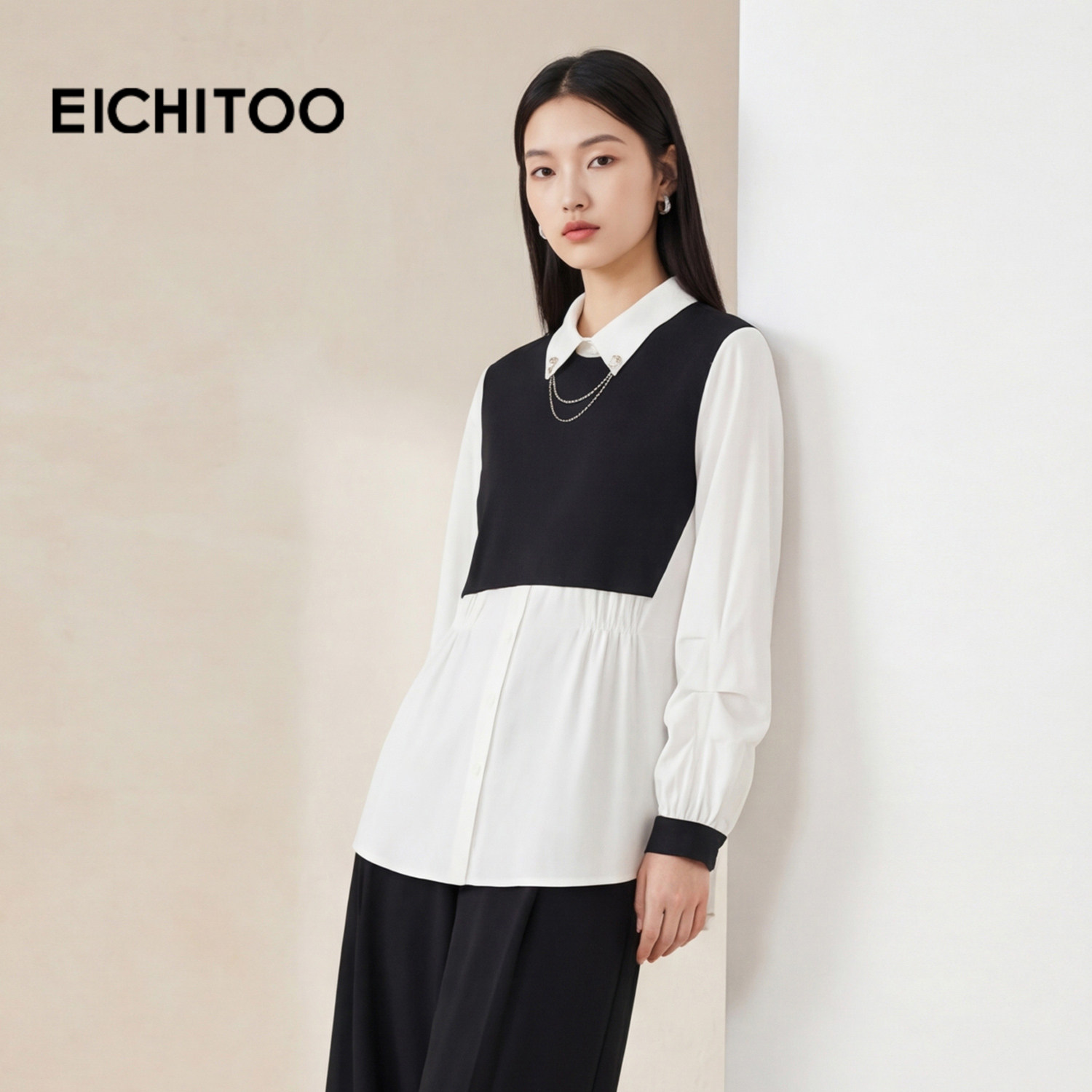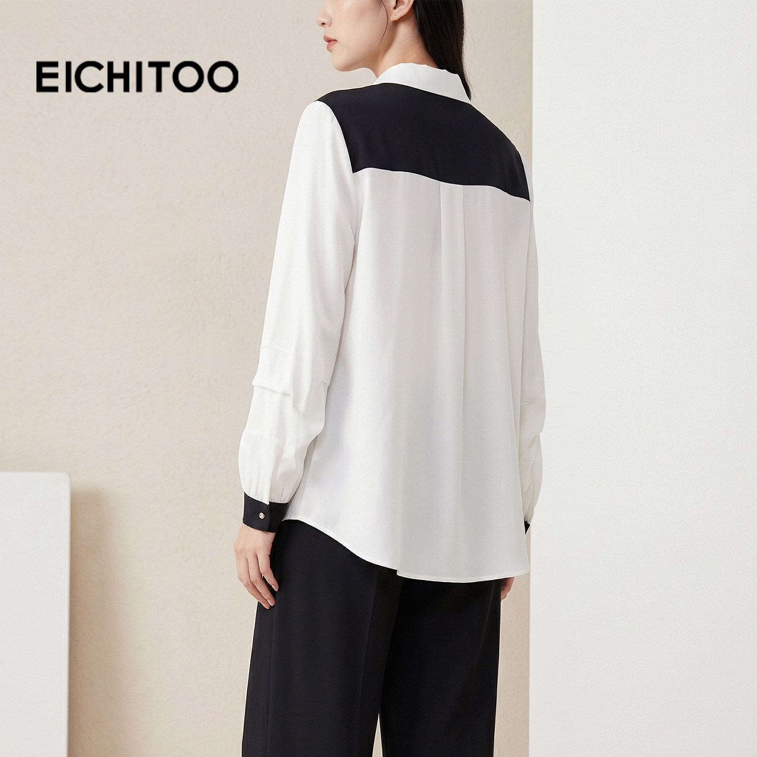 爱居兔黑白撞色设计感长袖衬衫女2026年春季新款翻领雪纺衫上衣