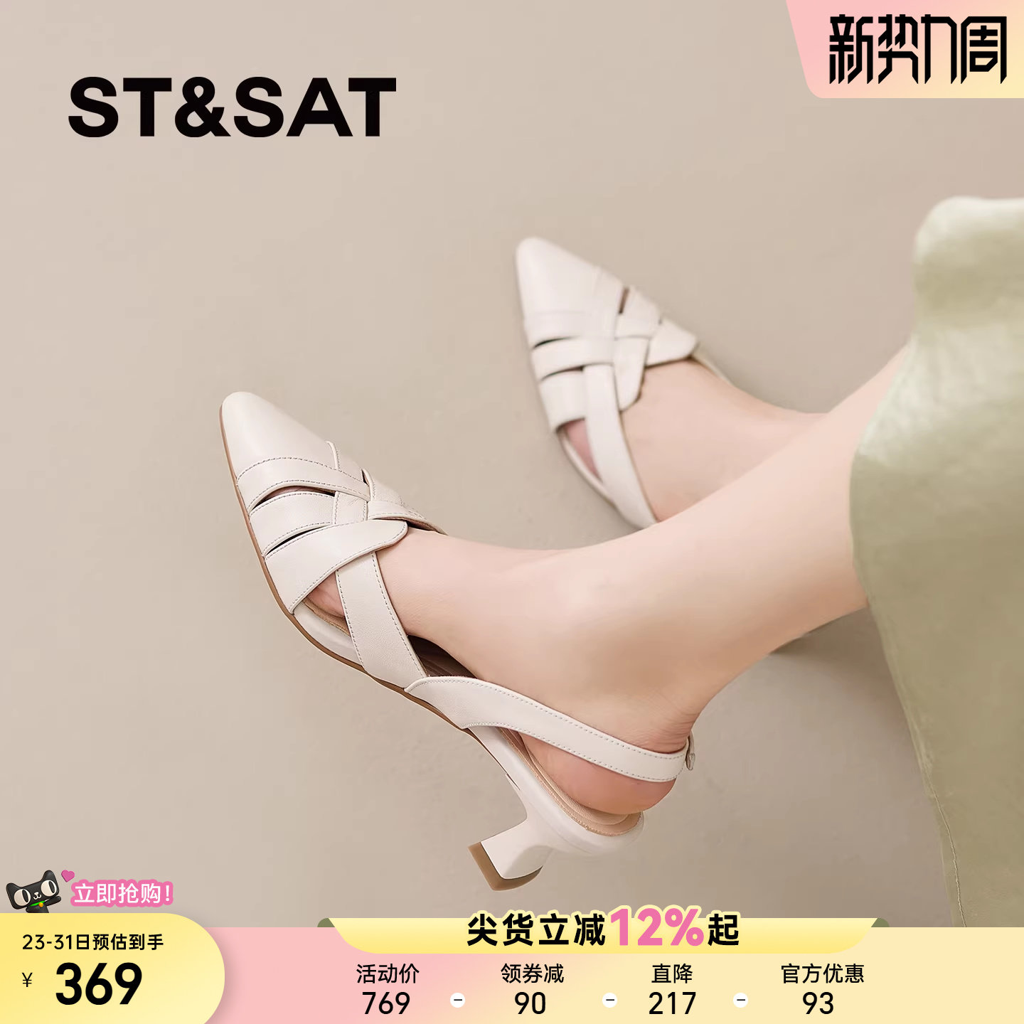 星期六真皮编织镂空尖头凉鞋女2026夏巨好看粗跟包头后空气质单鞋