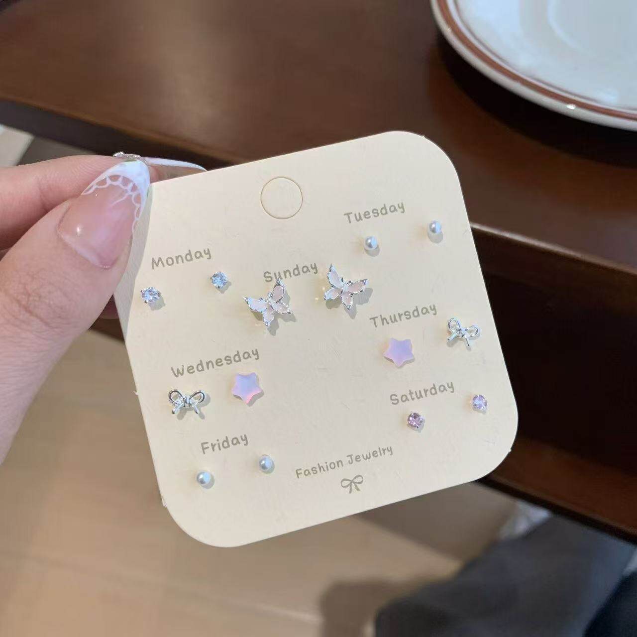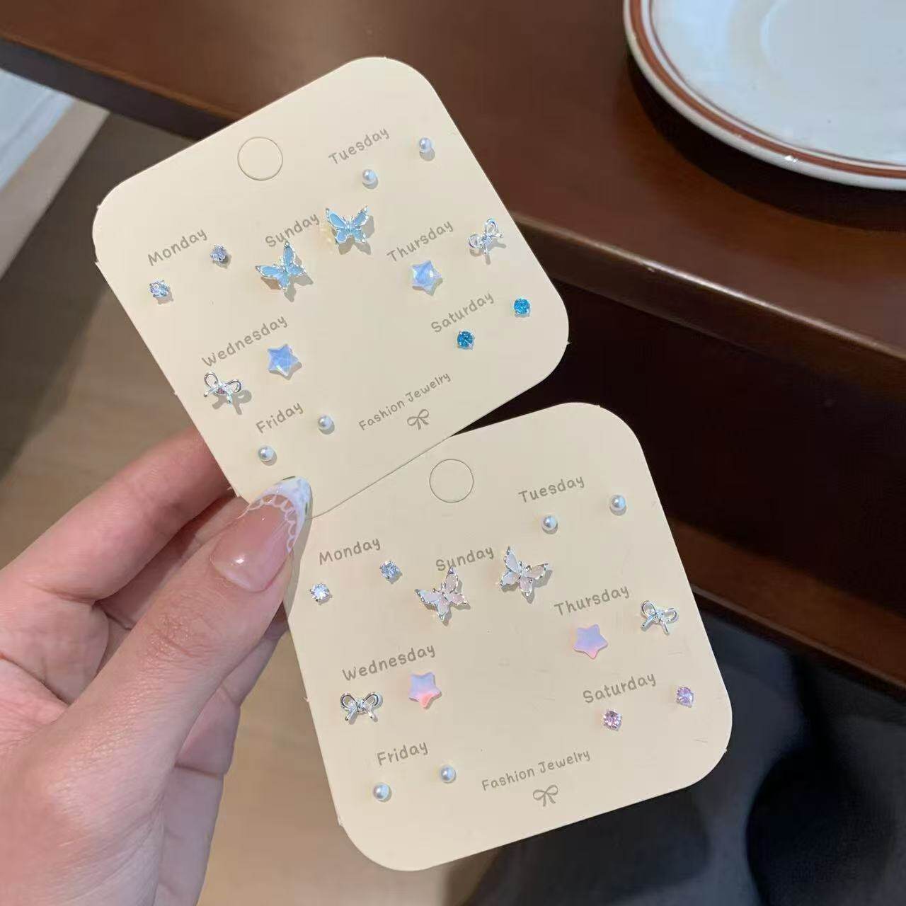 溪御新款蝴蝶结耳钉14件套女独特小众设计感耳扣耳圈蓝色粉色爱心