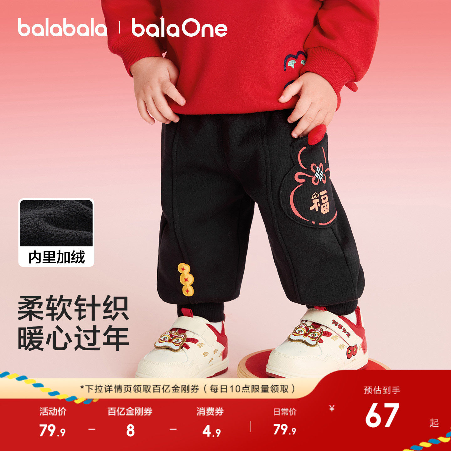 巴拉巴拉童装儿童长裤男女童2026冬装宝宝新款红色拜年服裤子加绒