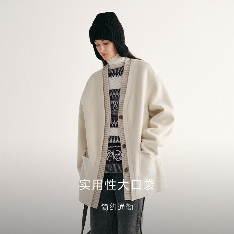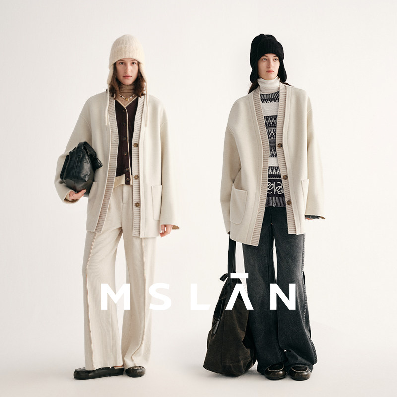 MSLAN轻轻毛呢 冬季解构拼接廓形羊毛大衣白色V领双面呢外套新品