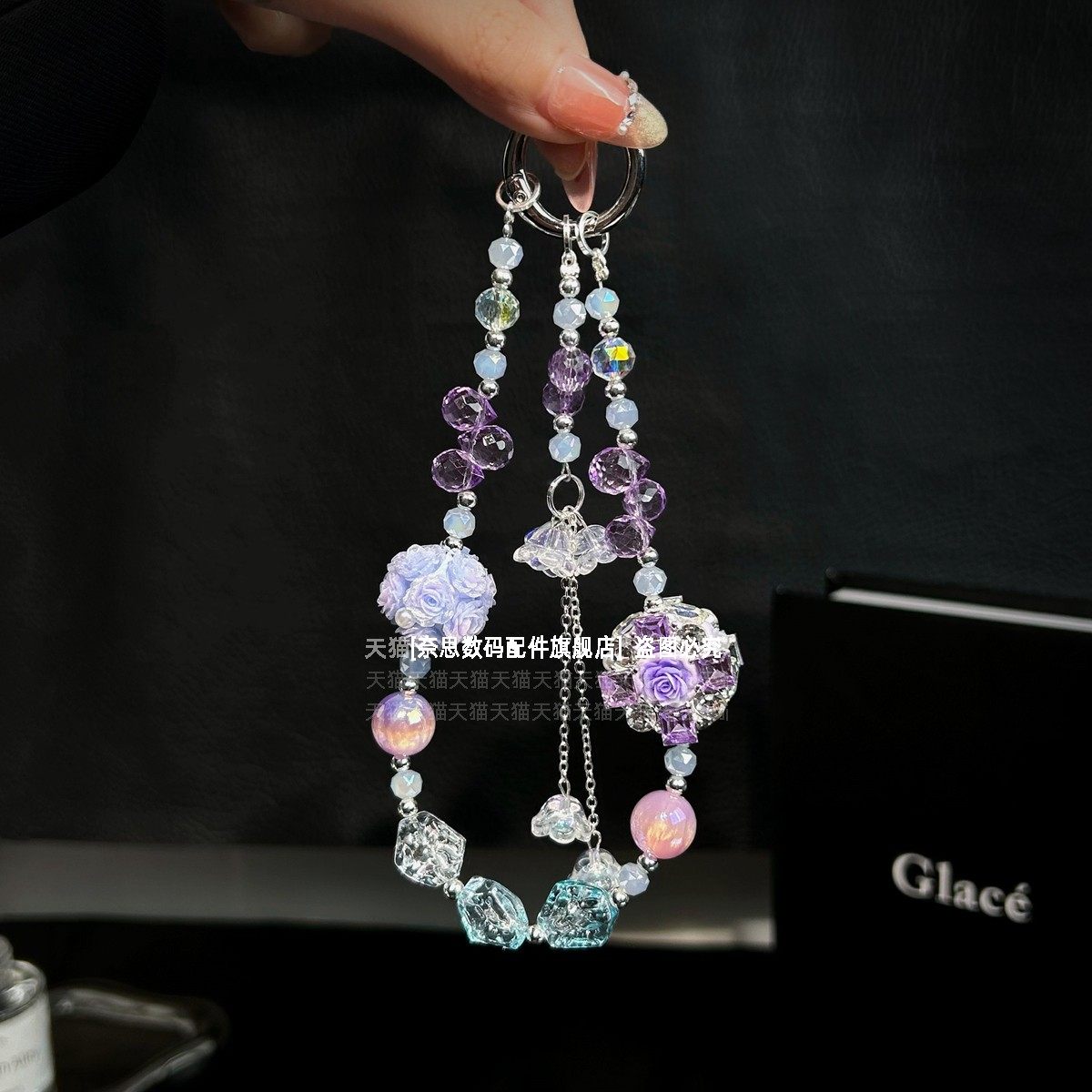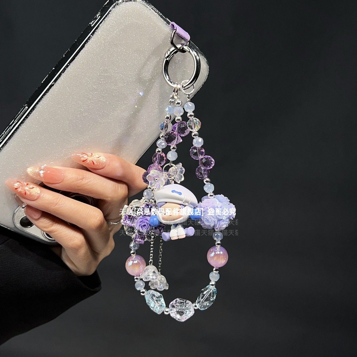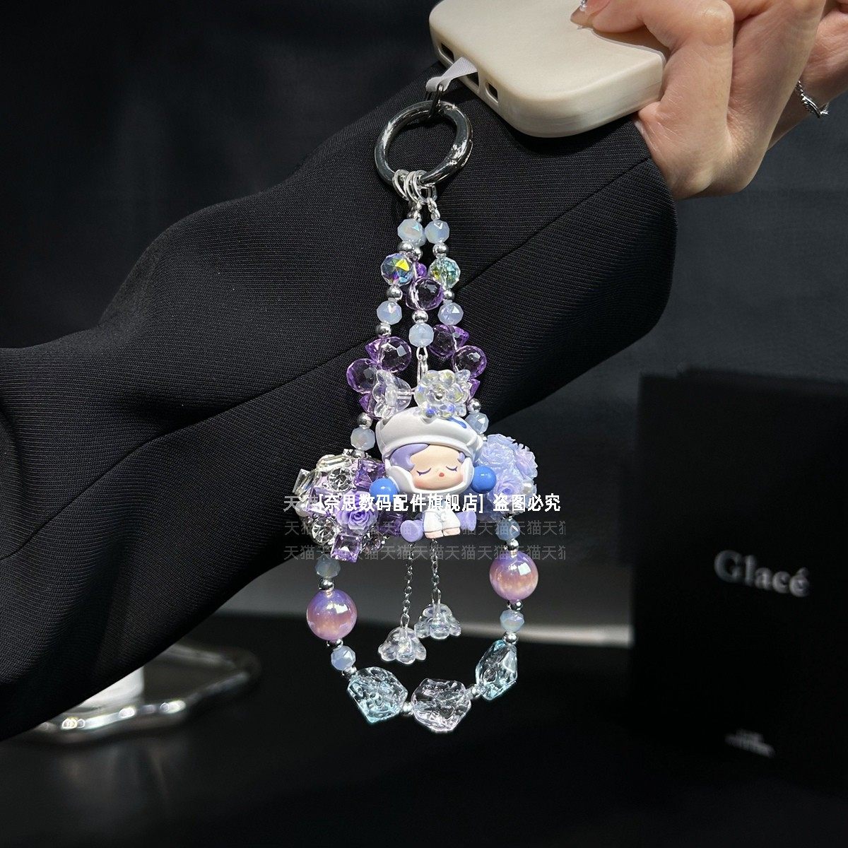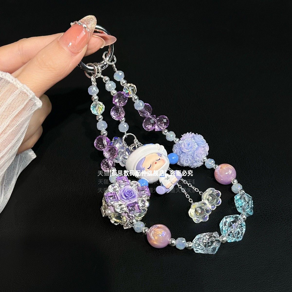 正版泡泡玛特手机链重工原创设计款挂链紫色冥想者手腕挂件汽车钥匙扣挂饰包包饰品精致绣球花串珠水晶手链壳