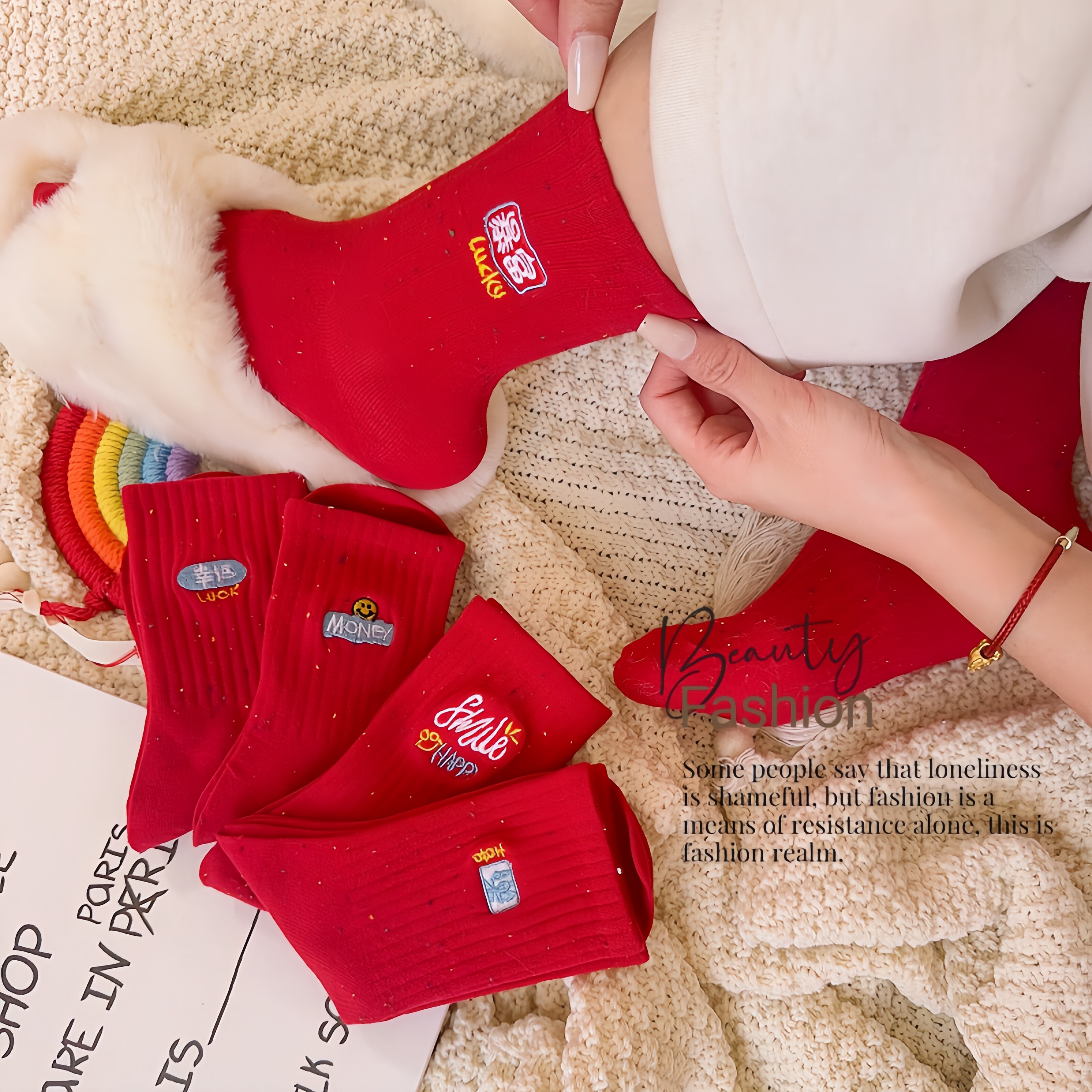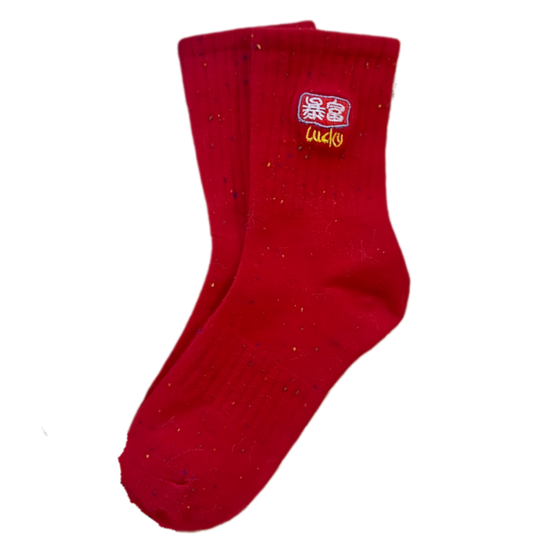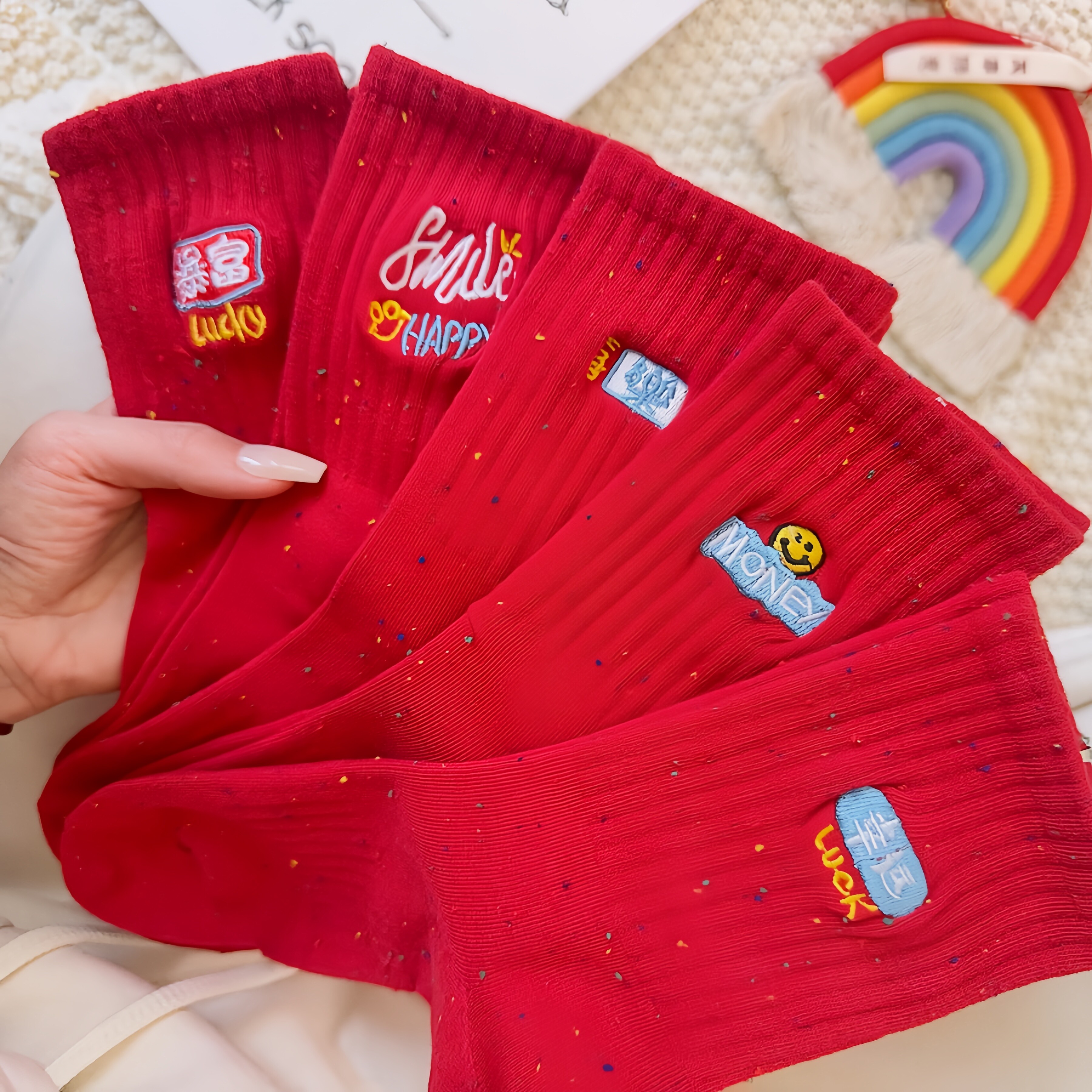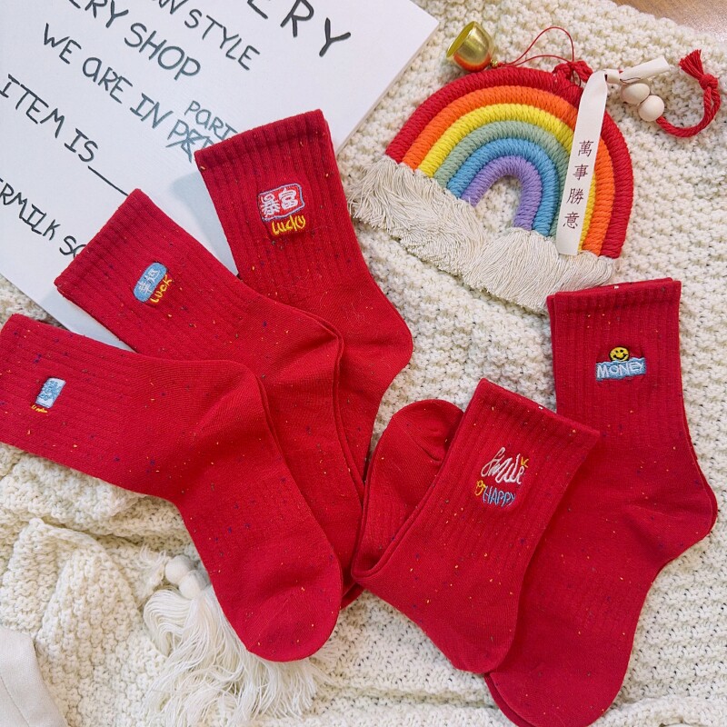 新年好运大红色中筒袜女刺绣祝福文字本命年过年袜子春节喜庆女袜