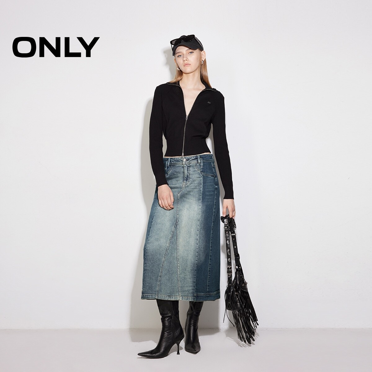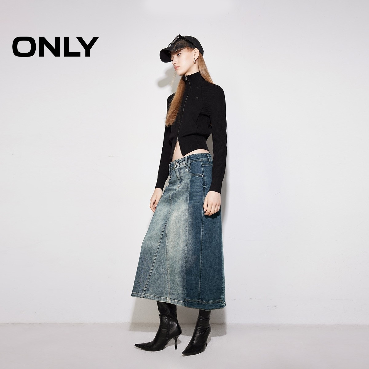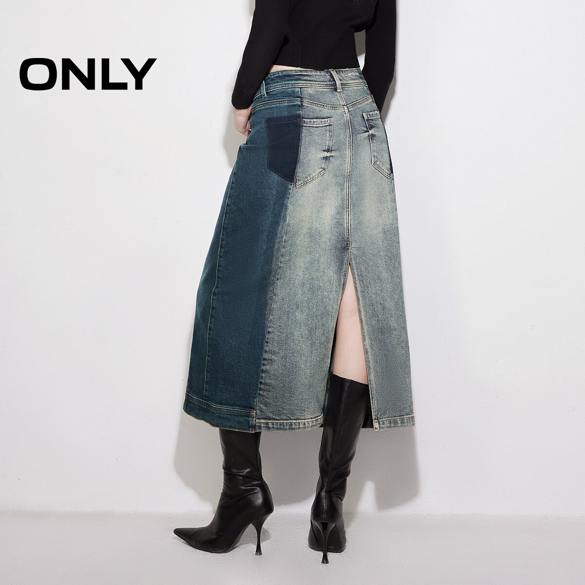 【ONLY奥莱】春季新款设计感撞色拼接高腰A字牛仔半身裙女