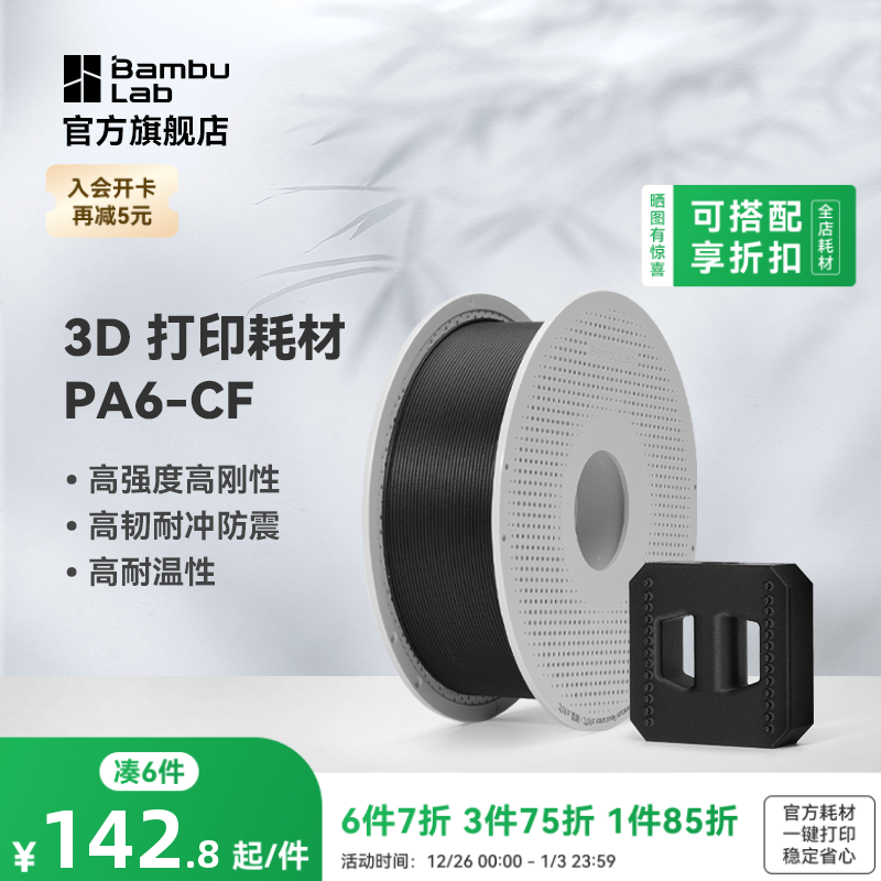 拓竹PA6-CF碳纤维增强尼龙6 3D打印耗材 高强度刚度 高韧抗冲 防震耐温
