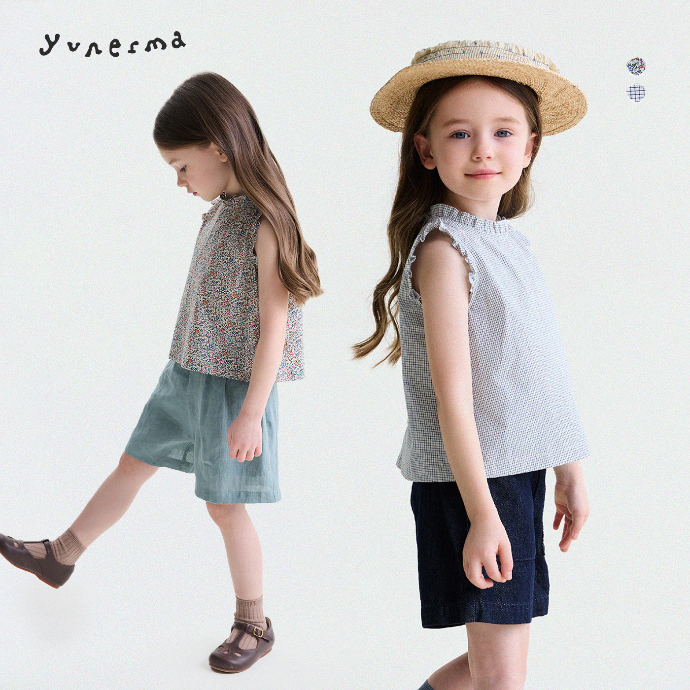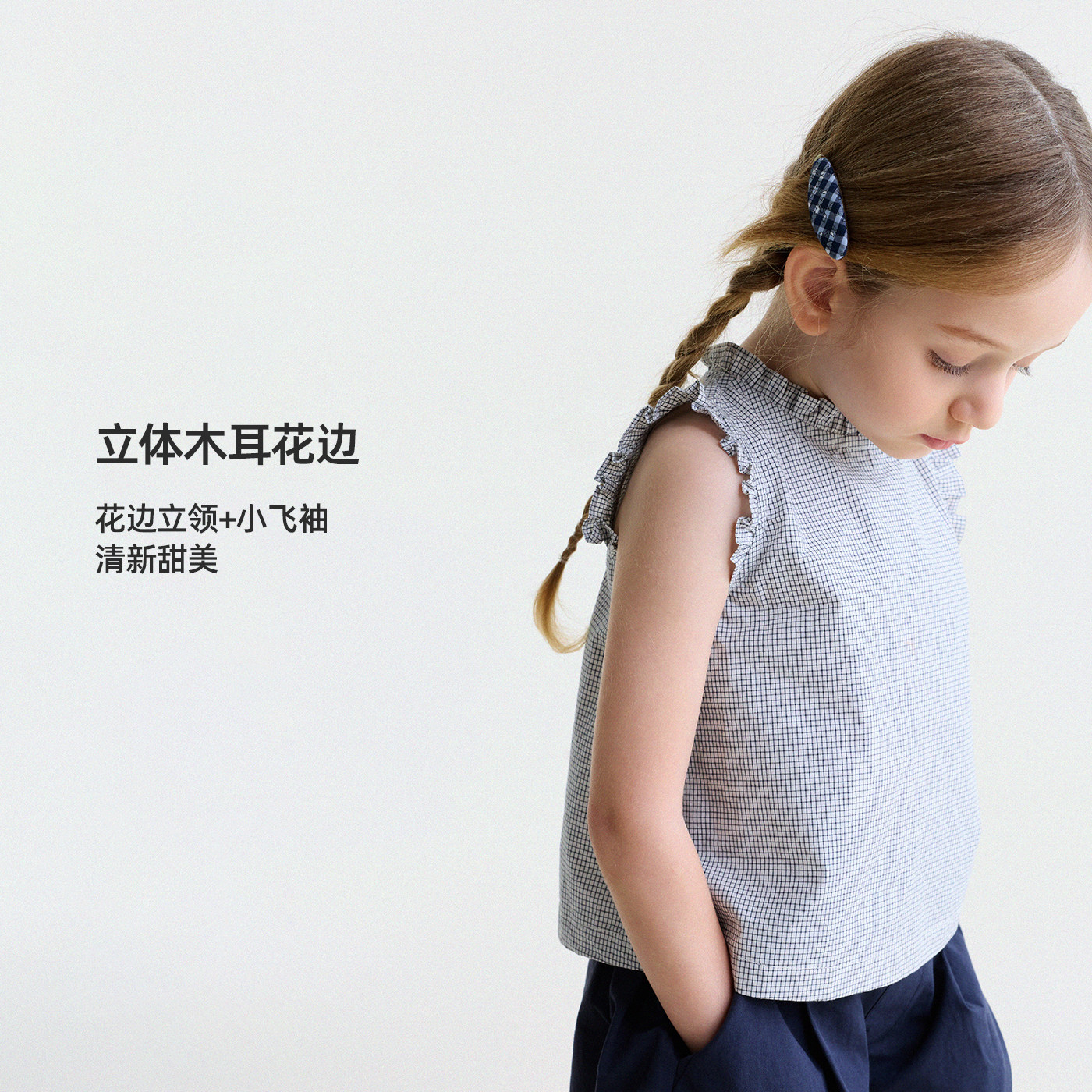 允儿妈女童夏季法式花边领格子背心儿童2026新款纯棉碎花无袖衬衫