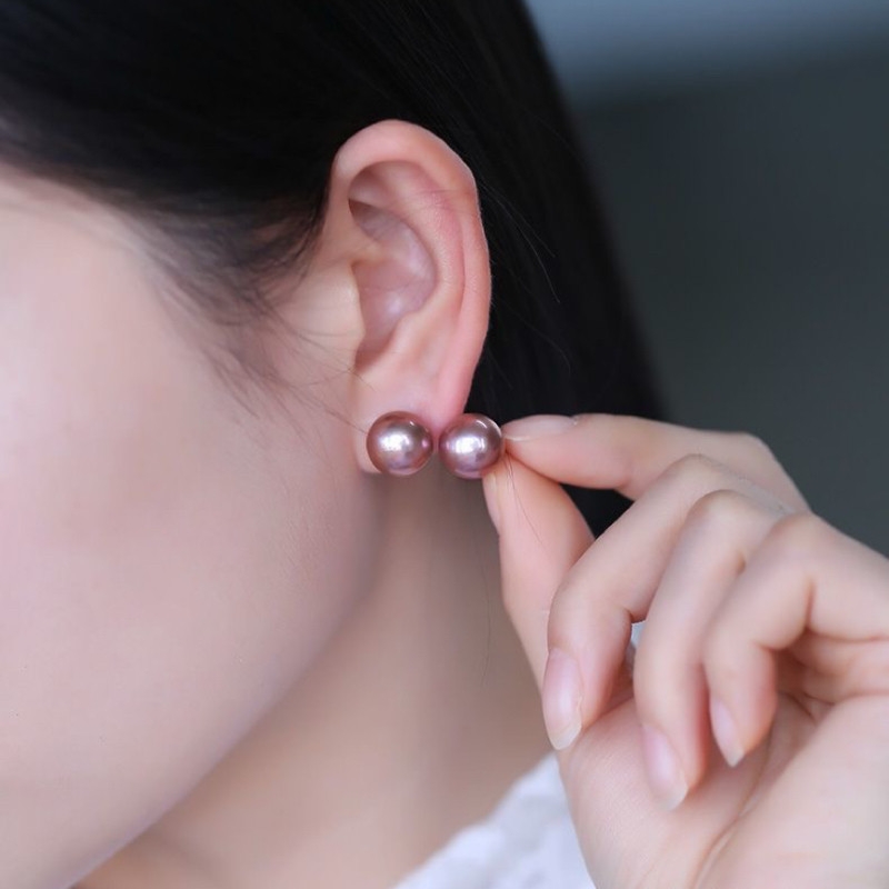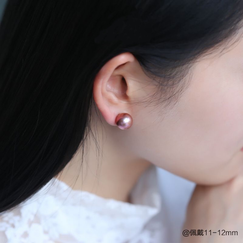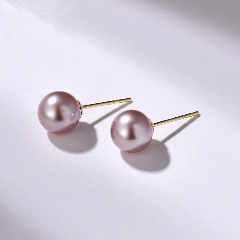 诸暨淡水紫色珍珠耳钉女18K金正圆强光耳饰经典气质礼物首饰黄金