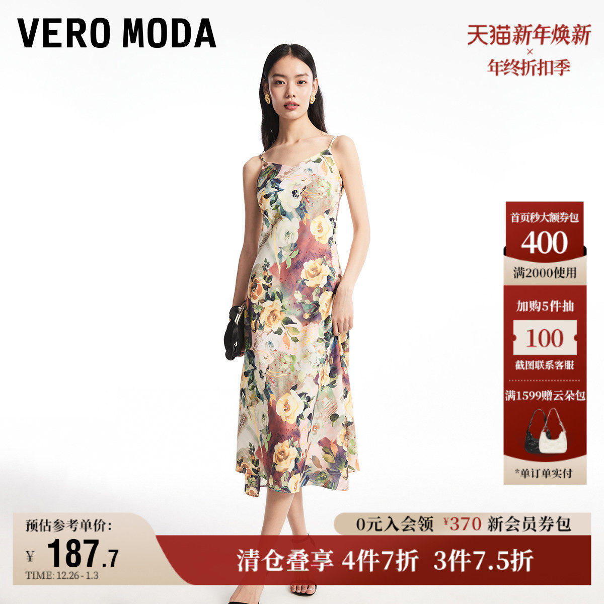 Vero Moda奥莱连衣裙秋冬新款V领A摆印花度假风吊带长裙子流行