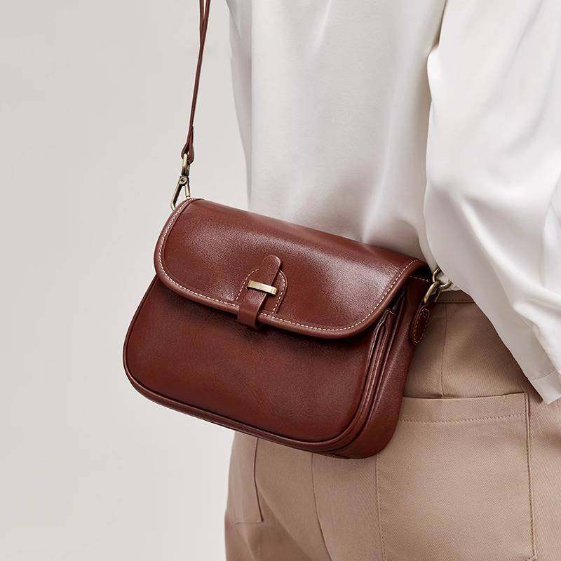 森系小清新复古油蜡牛皮简约横款小方包原创女士单肩包手机斜挎包