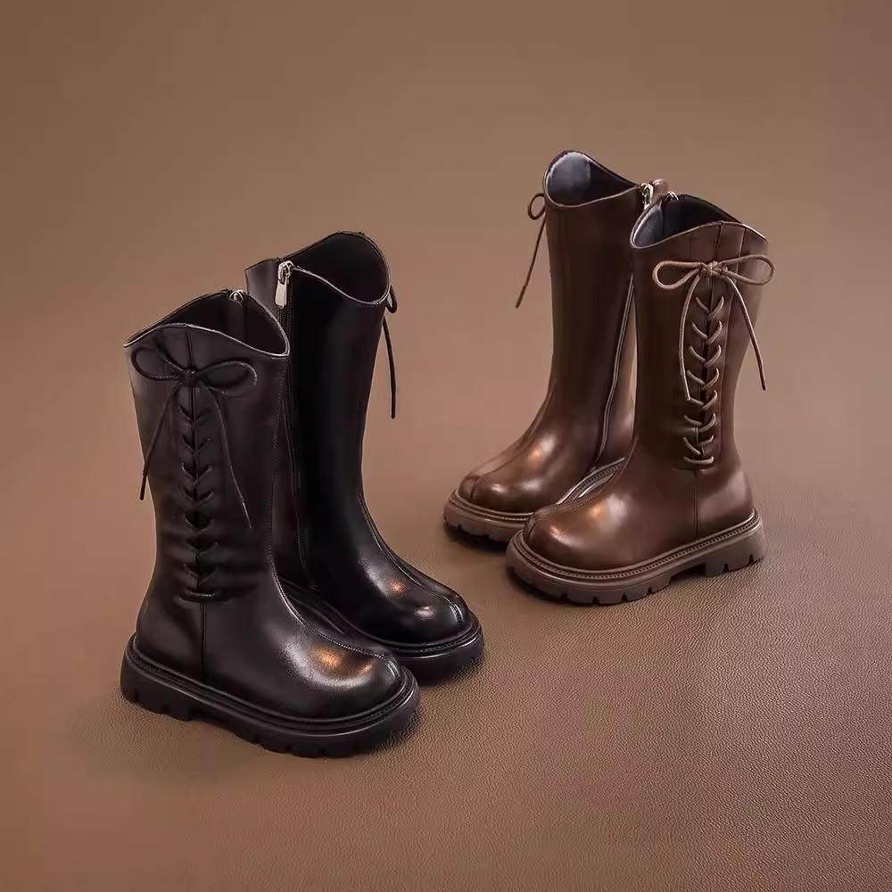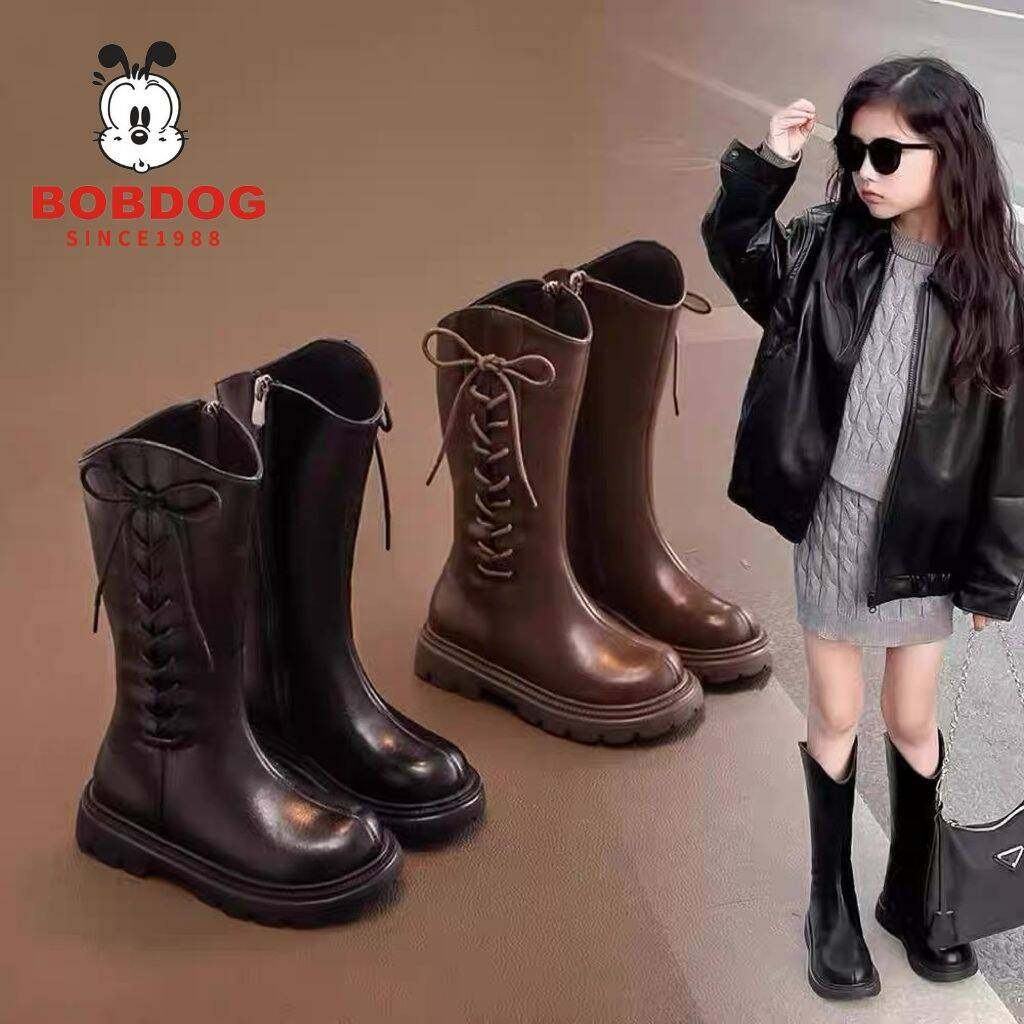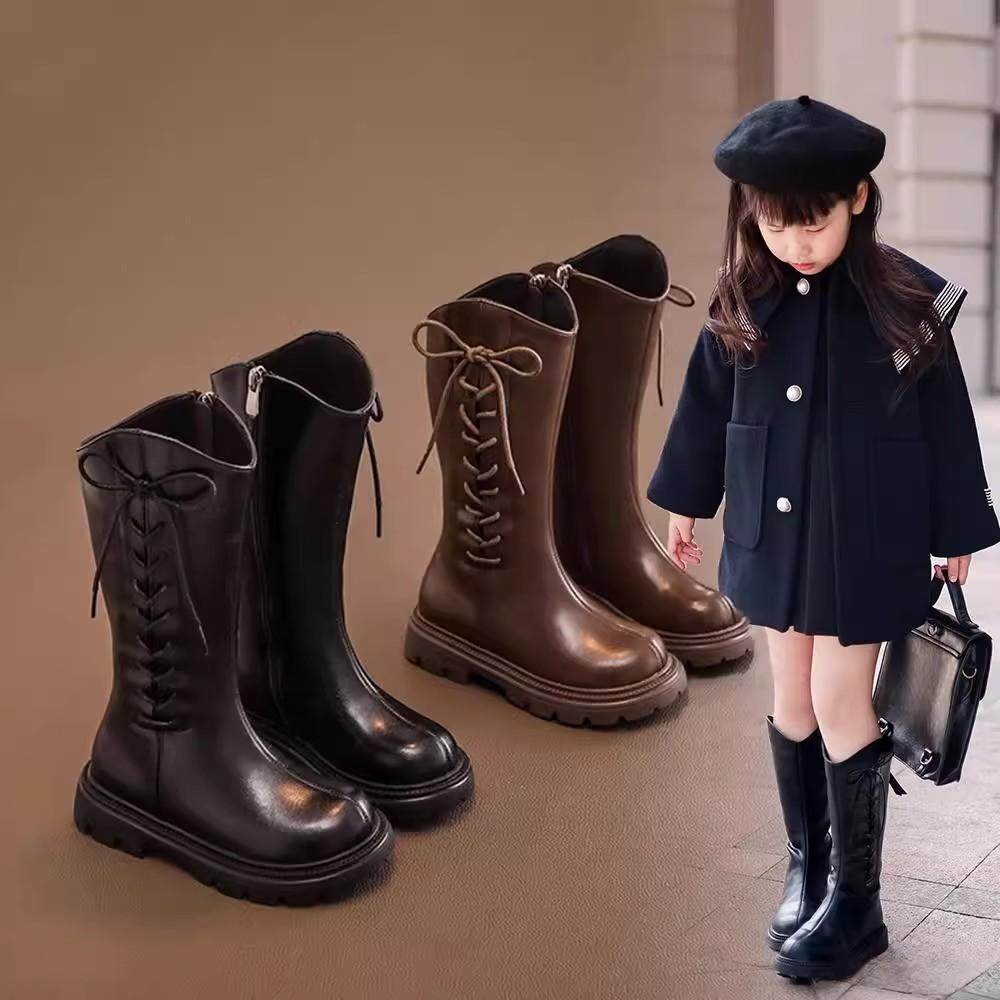 巴布豆女童高筒靴2025秋冬新款儿童女孩软底加绒骑士靴防滑黑色