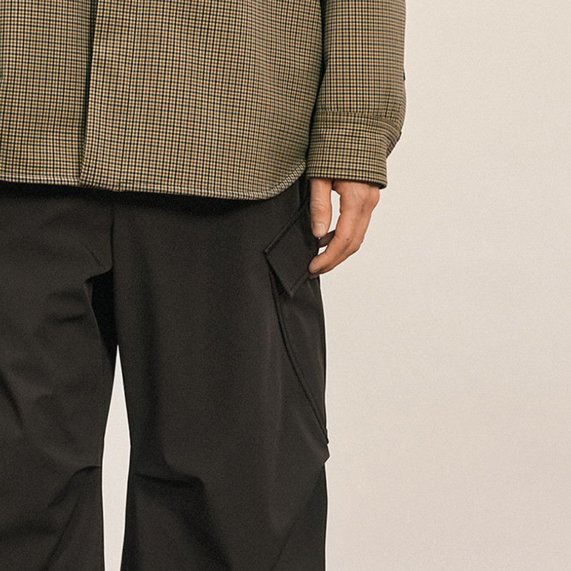 尼龙弹力复合面料,膝盖处褶量让整体更立体