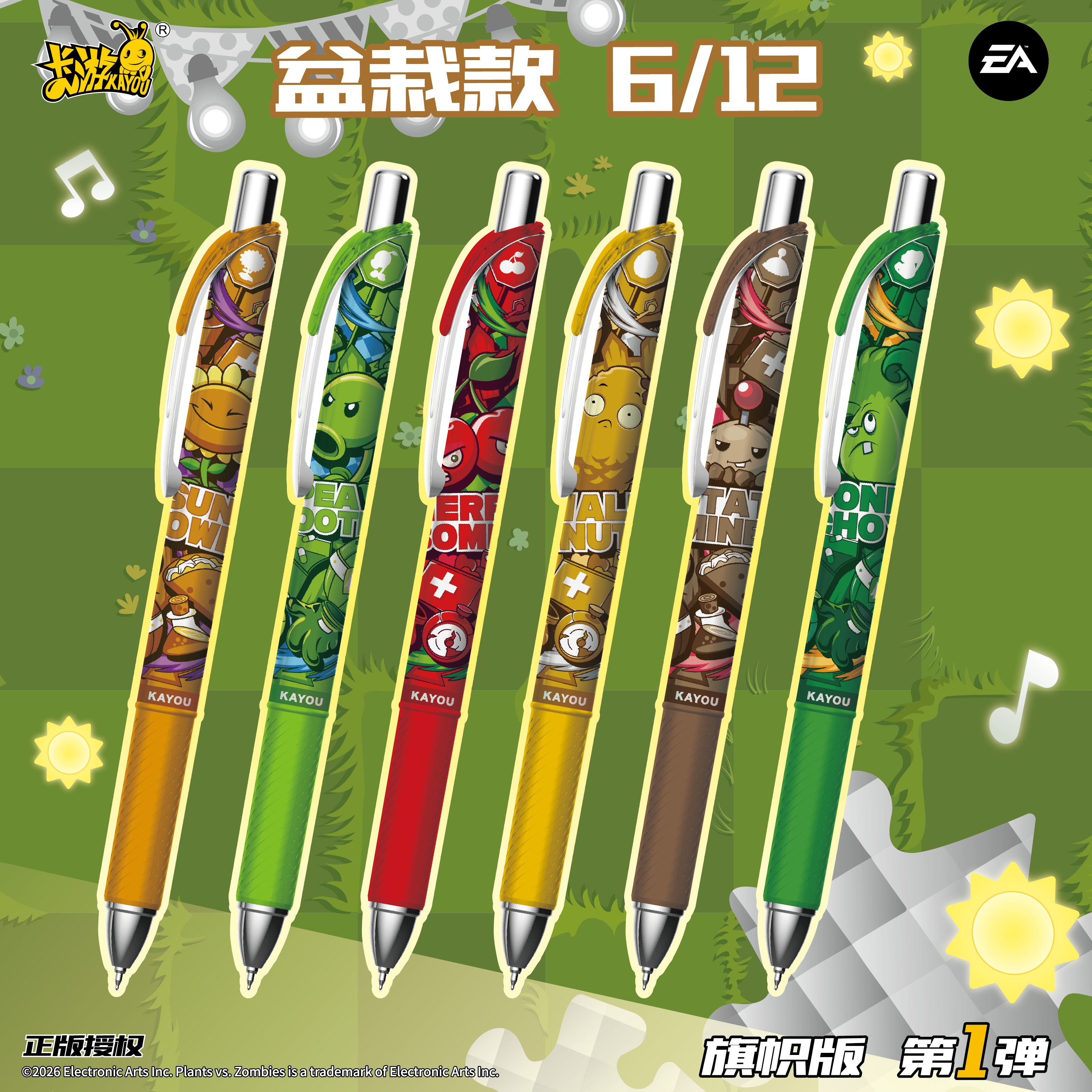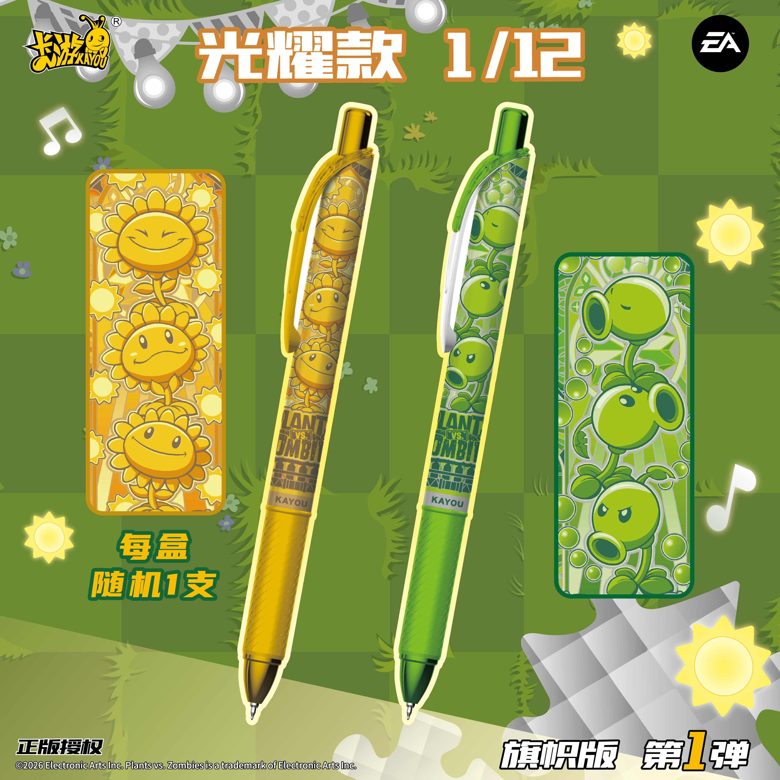 正版卡游 植物大战僵尸笔 第一弹旗帜版电音光耀款花园笔纪黑笔中性笔文具圆珠签字小学生学习用品按动盲盒笔
