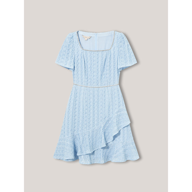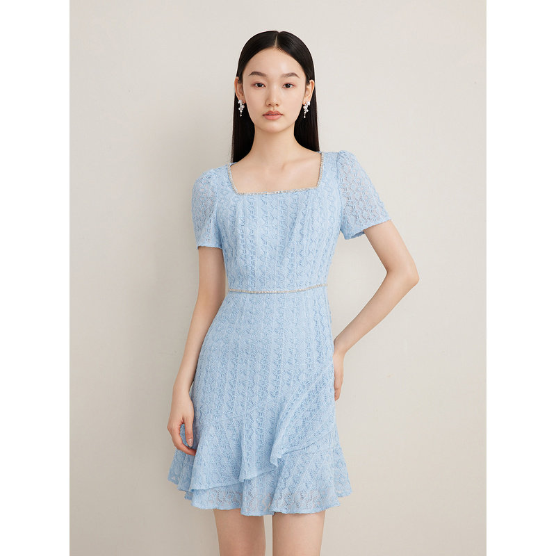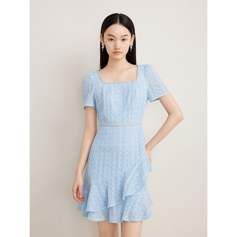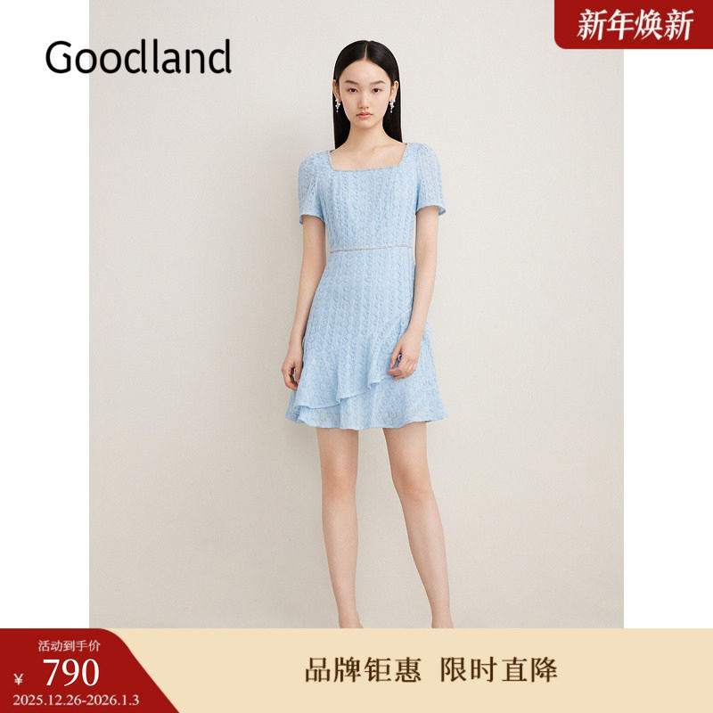 Goodland美地夏季艺术感镂空花纹荷叶花边蕾丝连衣裙