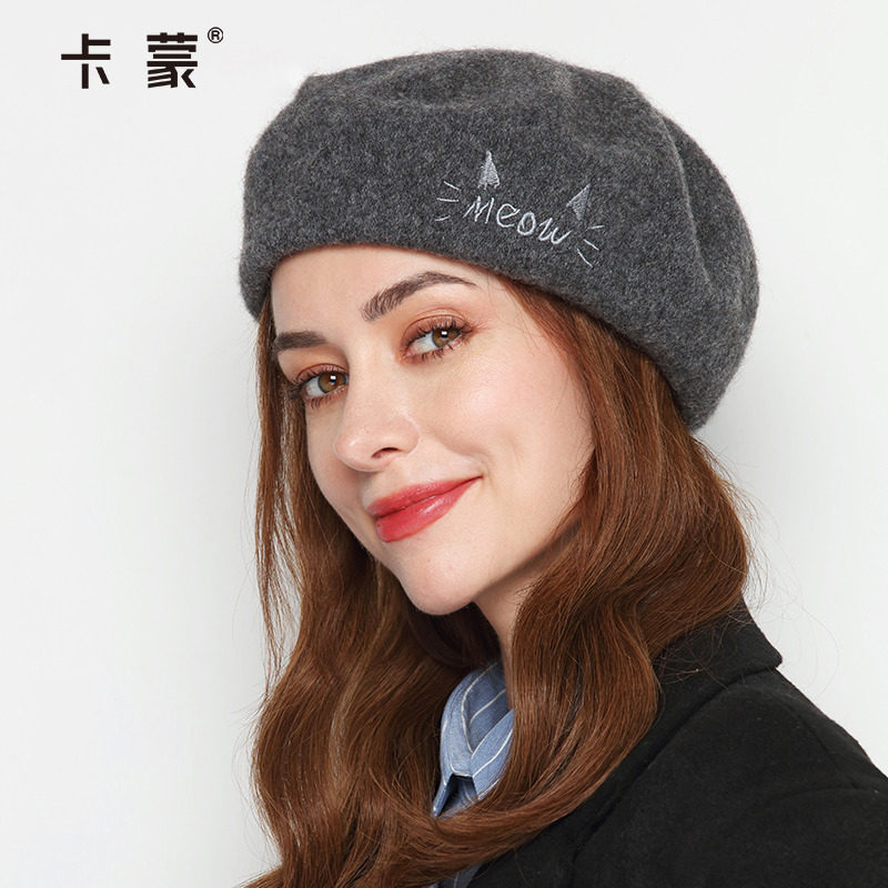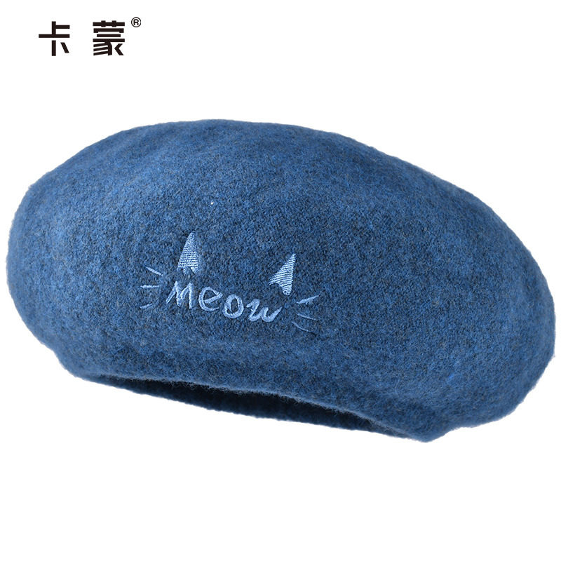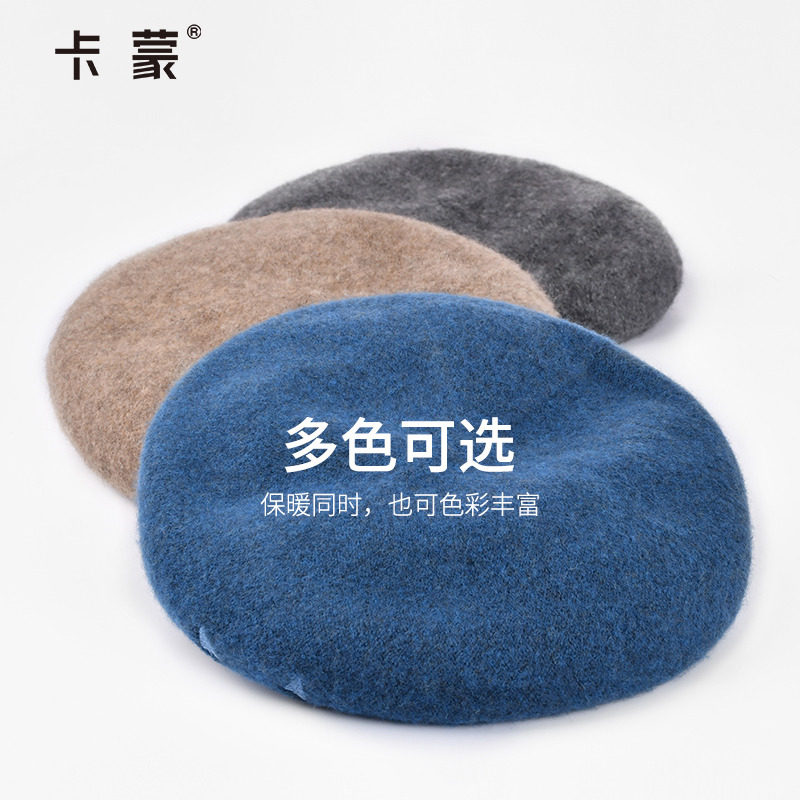 卡蒙纯色绵羊毛八角贝雷帽女秋冬可爱圆脸画家帽护耳保暖显脸小