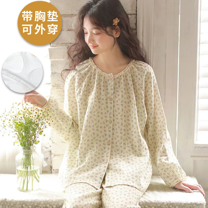 浪莎2025新款带胸垫睡衣女春秋季纯棉长袖长裤韩式家居服薄款套装