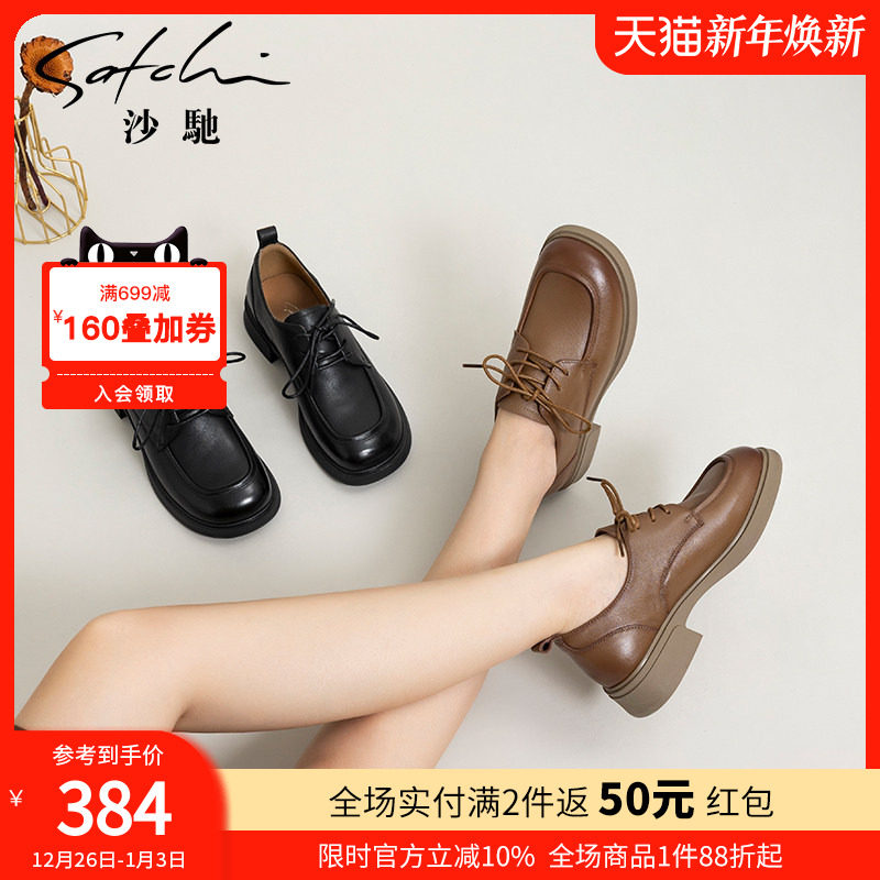 沙驰舒适女士小皮鞋2025秋冬新款经典系带中跟乐福鞋软底休闲单鞋