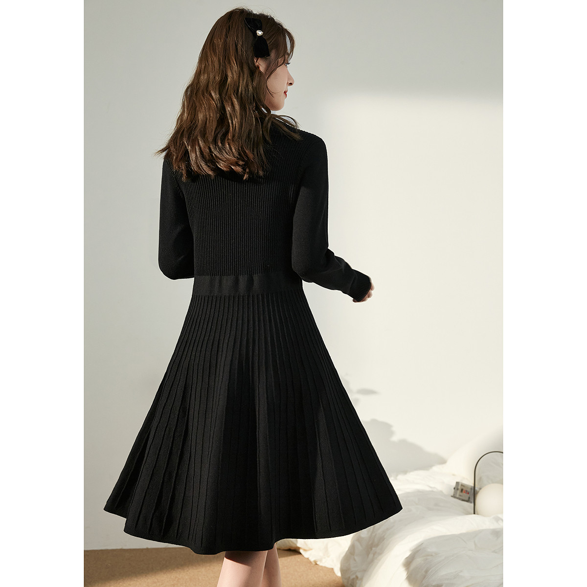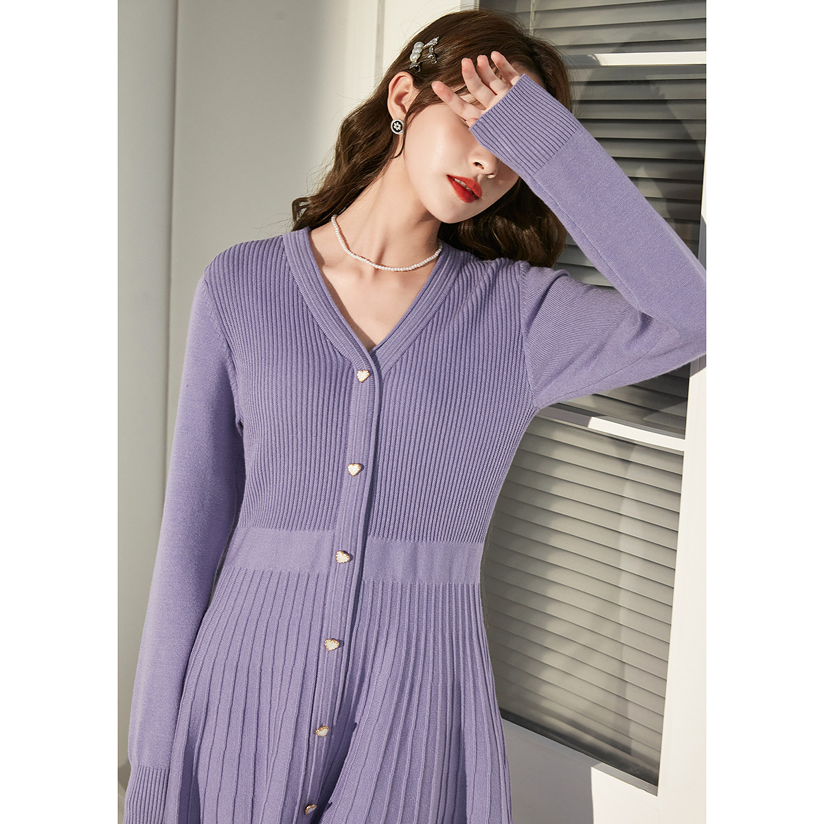 唐狮紫色v领连衣裙秋装长袖针织内搭打底裙毛衣裙秋季裙子长款TM