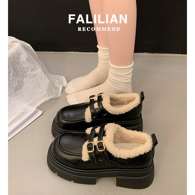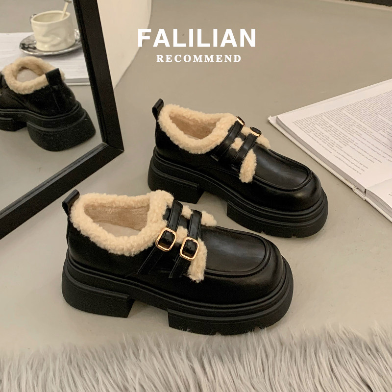 厚底乐福鞋女2025新款秋冬加绒单鞋子百搭毛毛棉鞋增高黑色小皮鞋