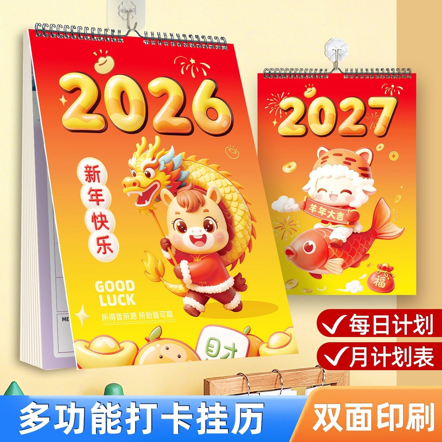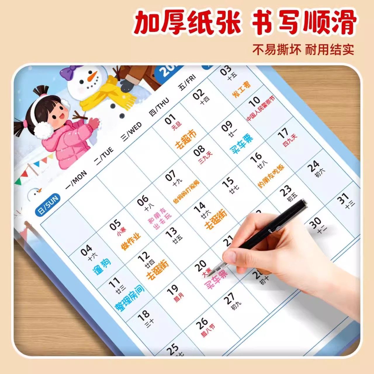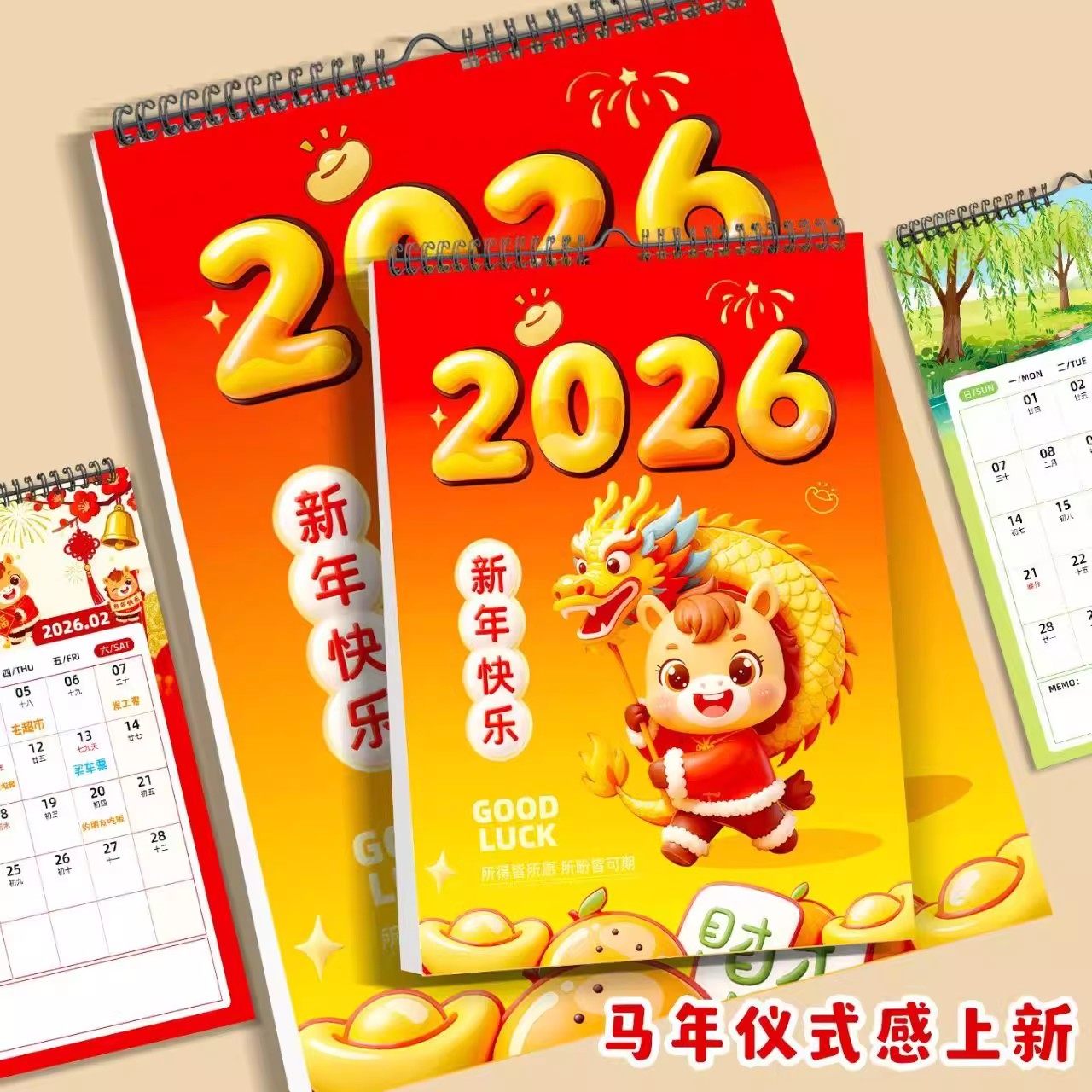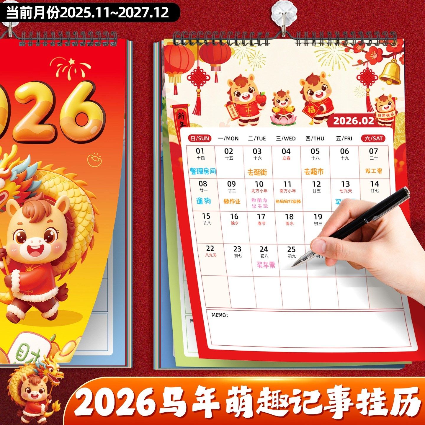 2026马年挂历2025跨年卡通可爱大数字农历记事年历摆件家用挂墙大号挂式台历备忘计划日历本大格子365天月历