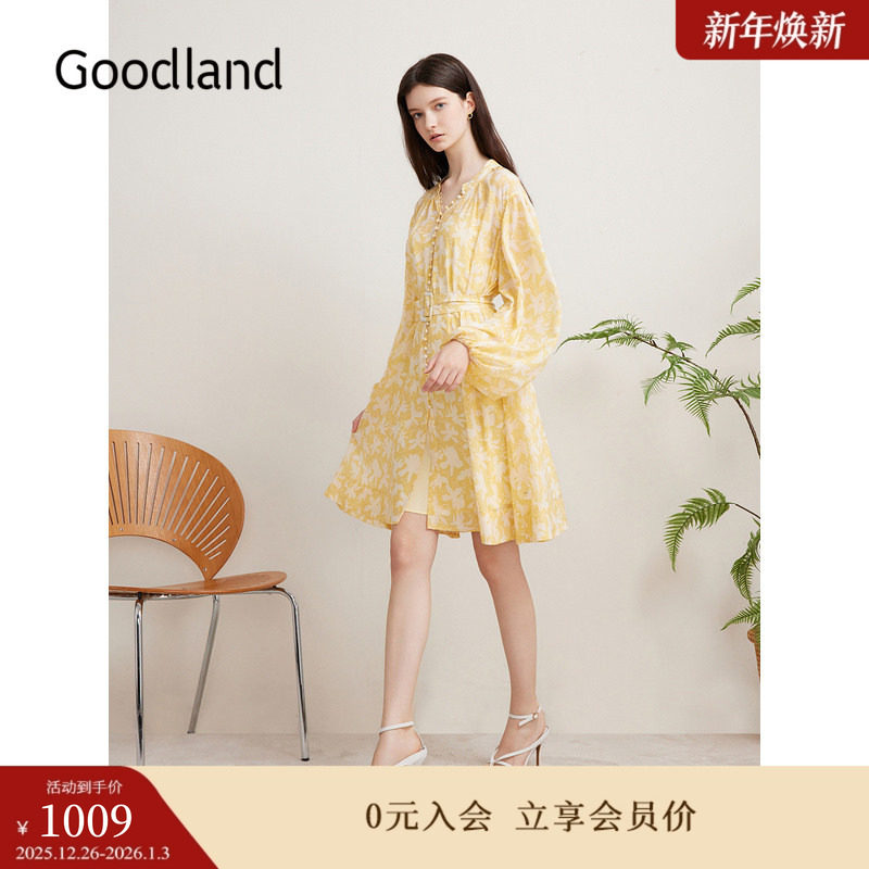 【真丝系列】Goodland美地春季法式浪漫系带V领连衣裙