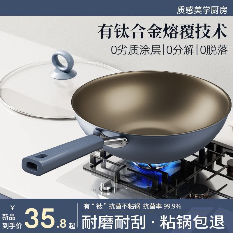 钛锅炒锅不粘锅家用有钛平底锅不沾锅燃气灶电磁炉专用炒菜锅精铁