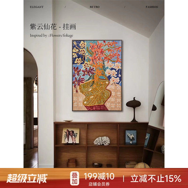 蜡笔派紫云仙花挂画中古风氛围感客厅入户玄关挂毯画氛围装饰画