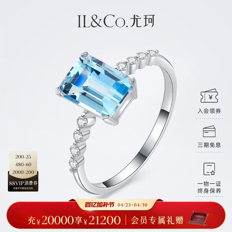 ILCO尤珂「冰蓝方糖」18K金天然海蓝宝石戒指时尚方形彩宝女款戒