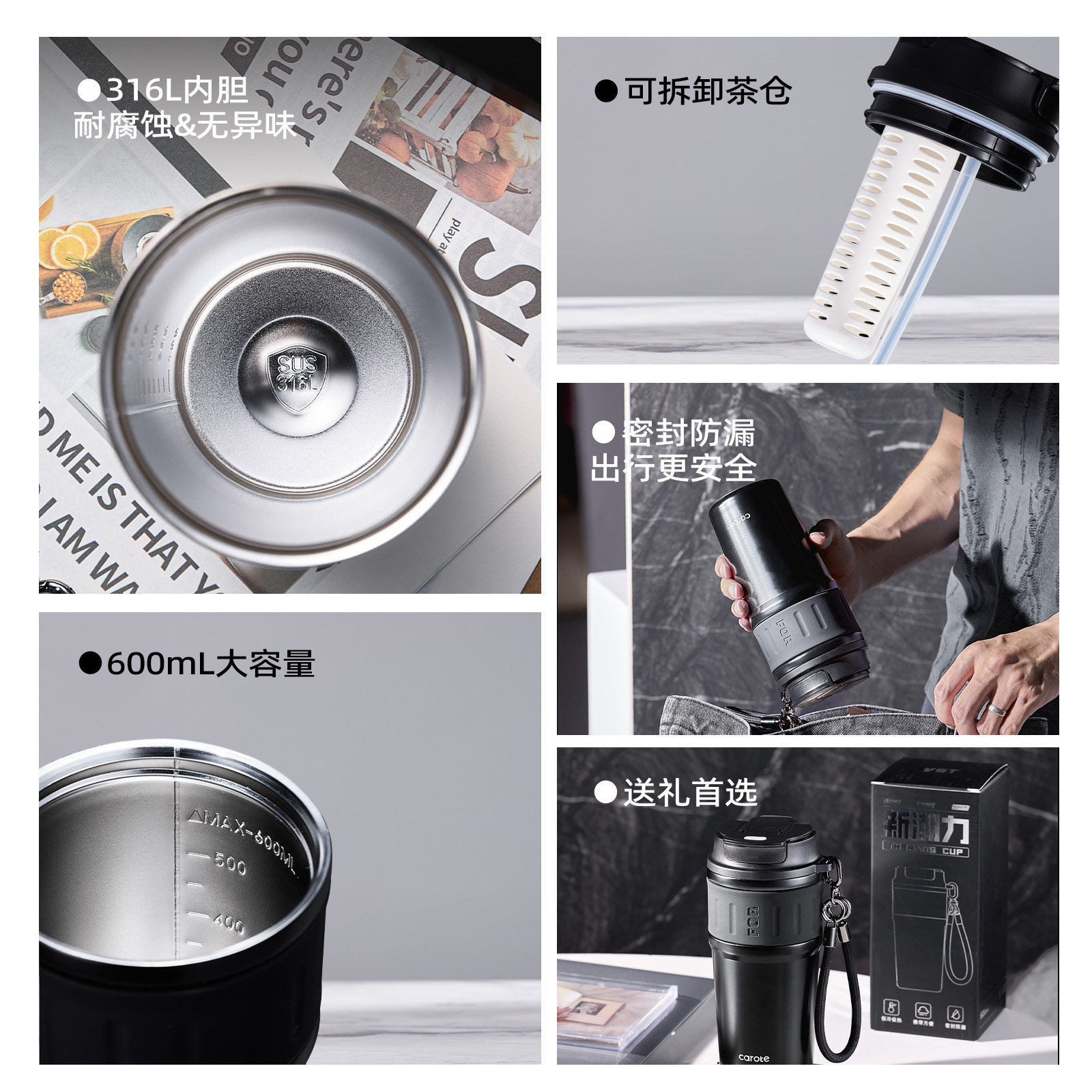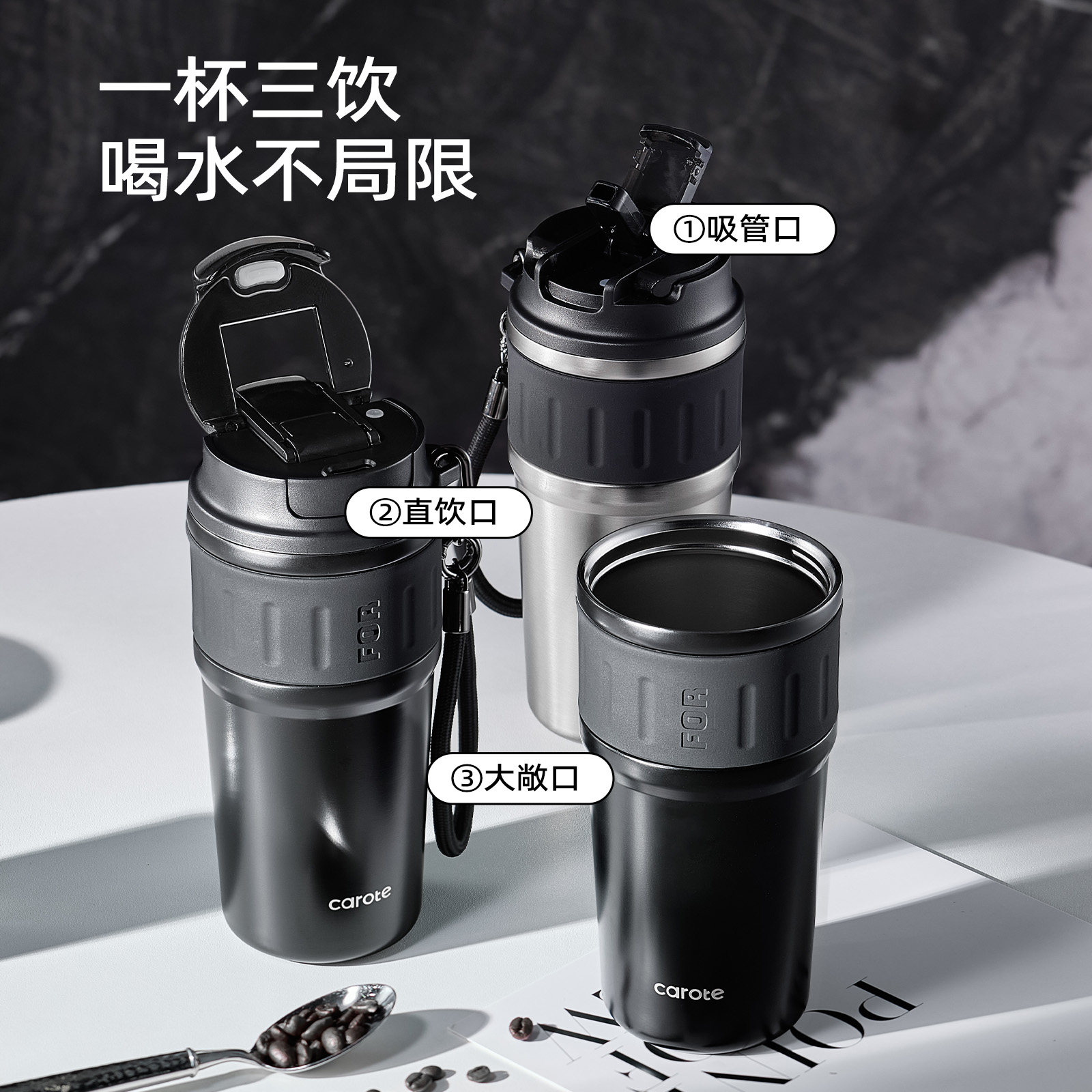316L不锈钢材质 一杯三饮 便携咖啡杯