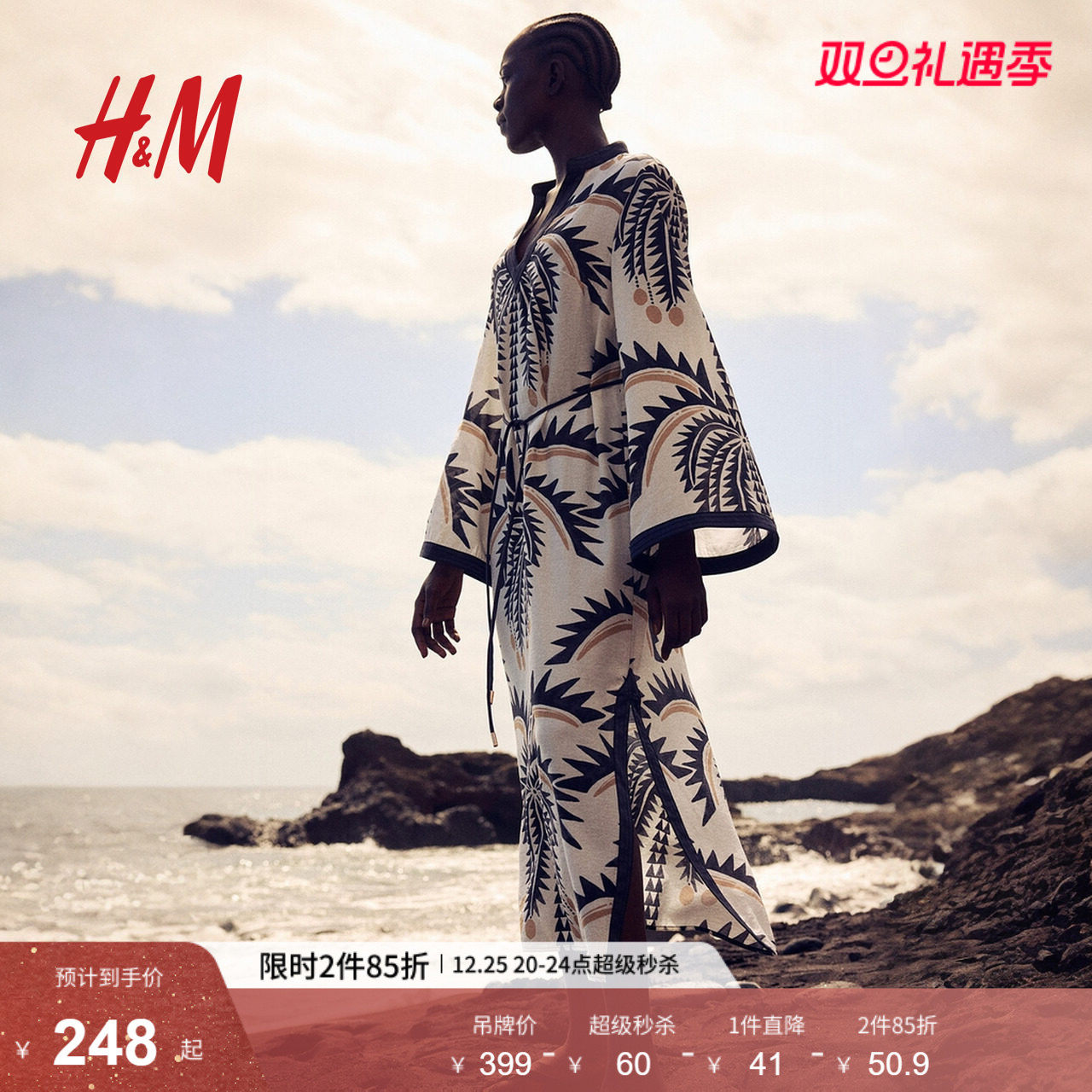 HM女装连衣裙2025冬季新款腰部系带裙衫式植物印花长裙1289486