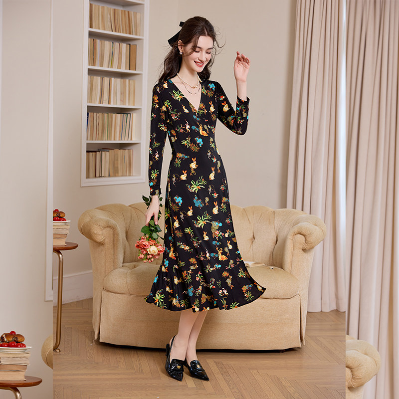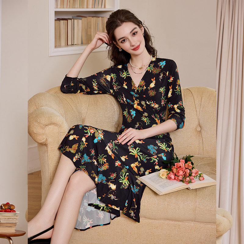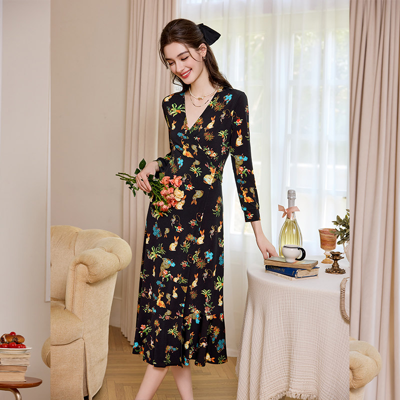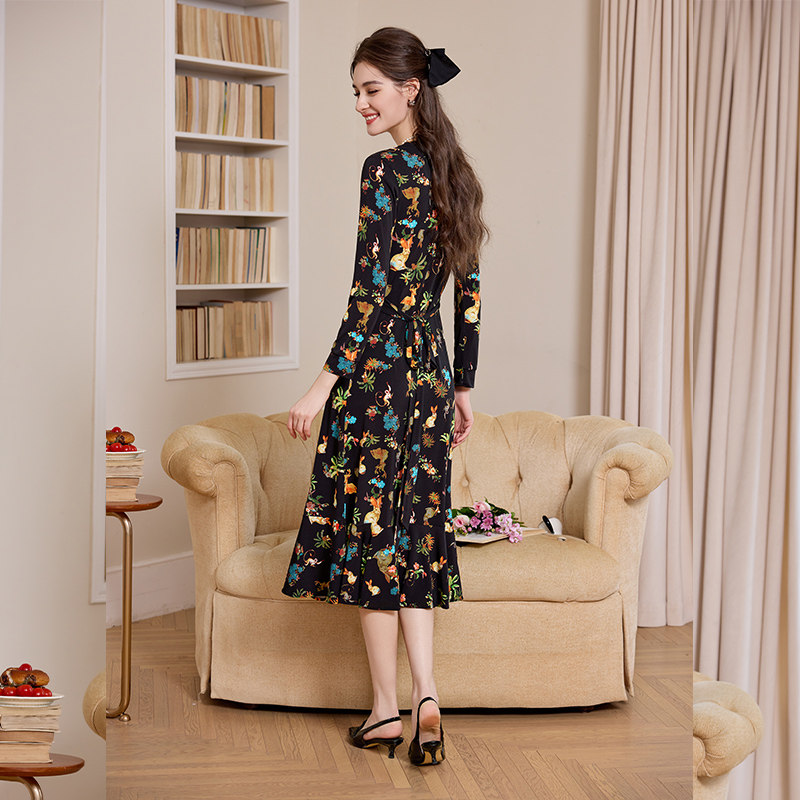 布料柔软有垂感 收腰修身印花裙