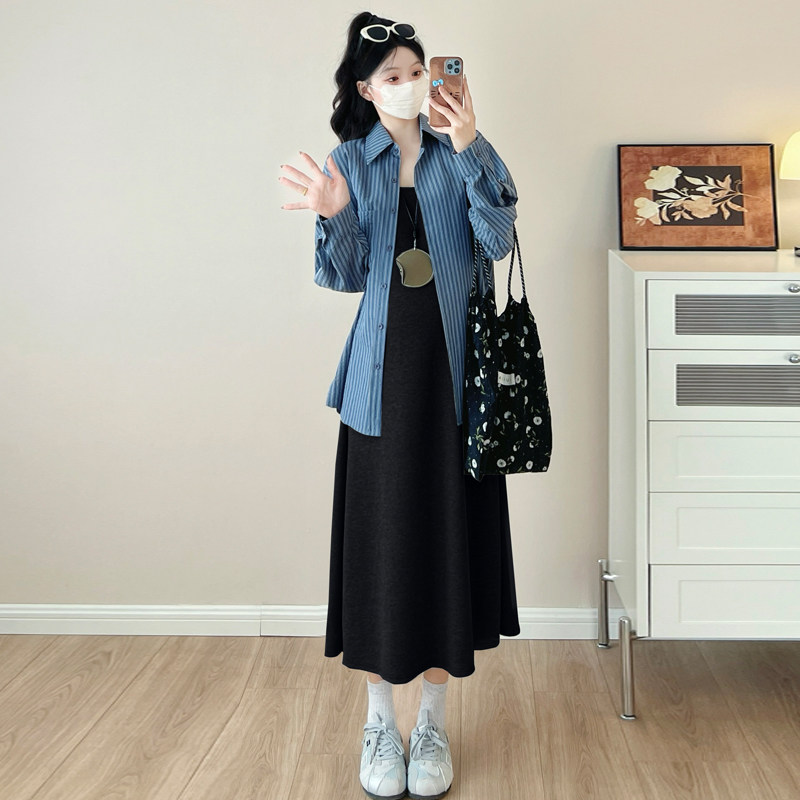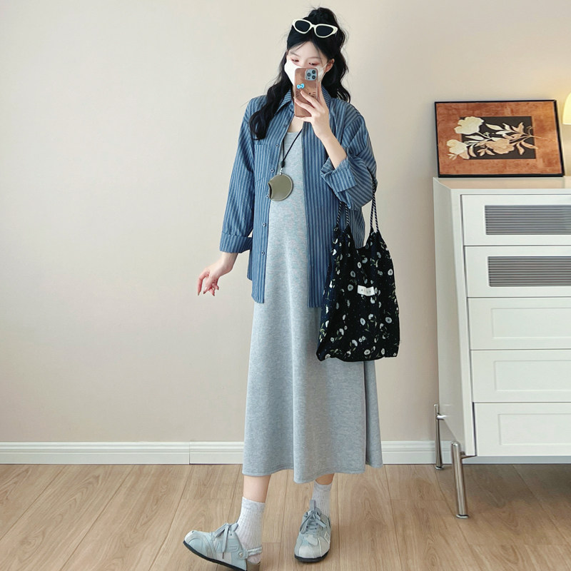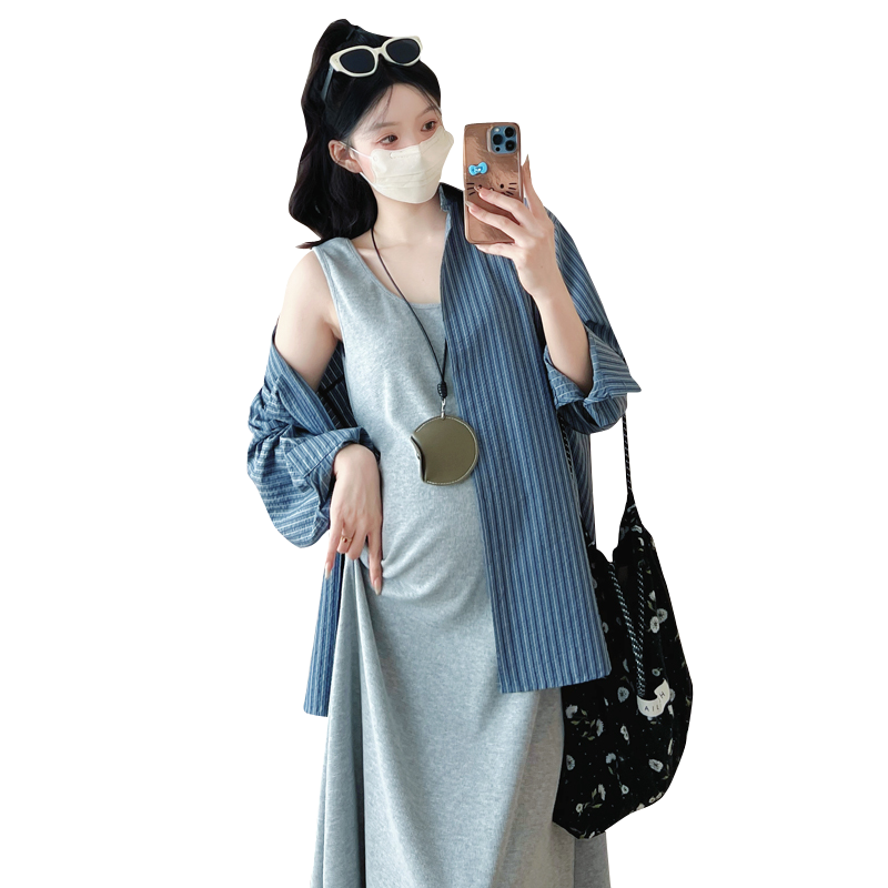 婧麒孕妇装2025新款秋装连衣裙背心裙两件套条纹长袖衬衣时尚套装