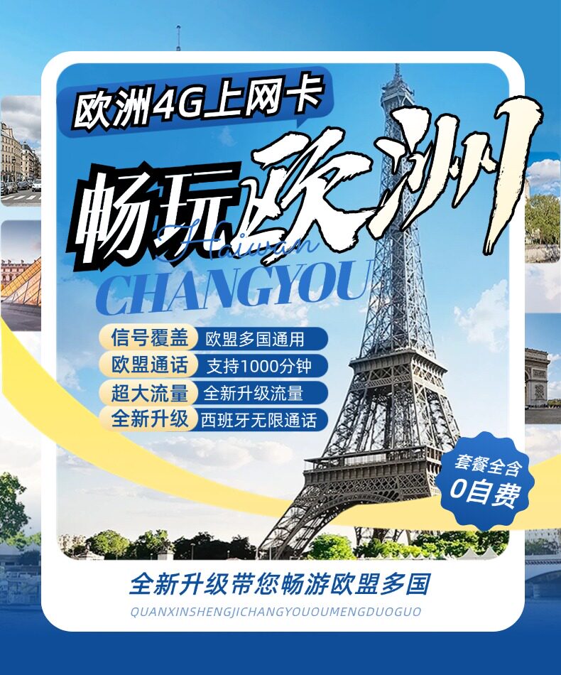 支持欧盟多国上网,打电话,高速4G,多天数,套餐可选,旅行商务