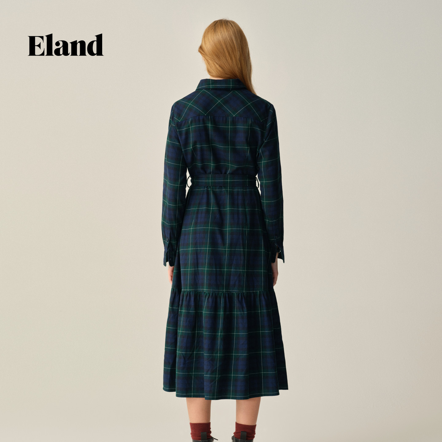 【100%棉】Eland衣恋连衣裙女英伦风收腰格纹长裙2025冬季新款