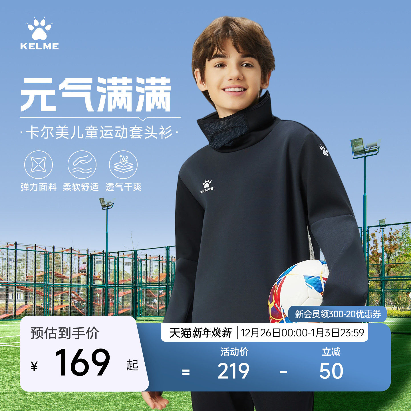 KELME卡尔美足球训练服长袖跑步运动面罩卫衣儿童新款套头衫上衣