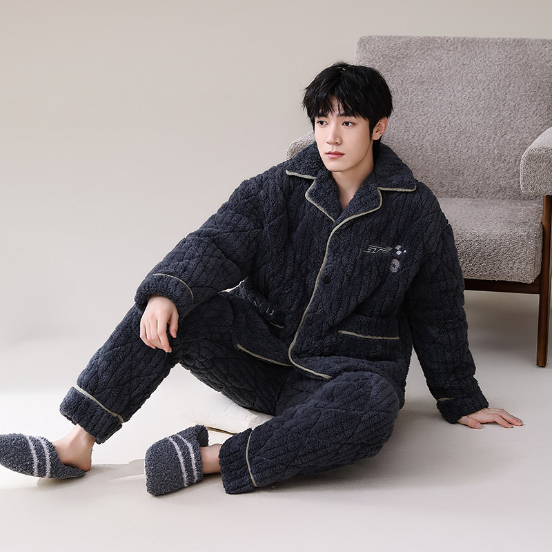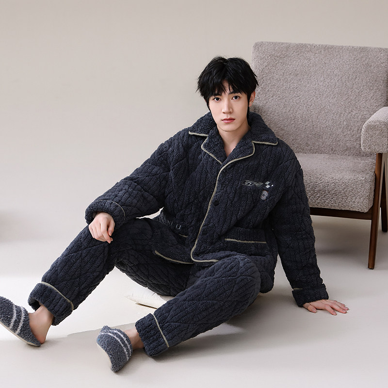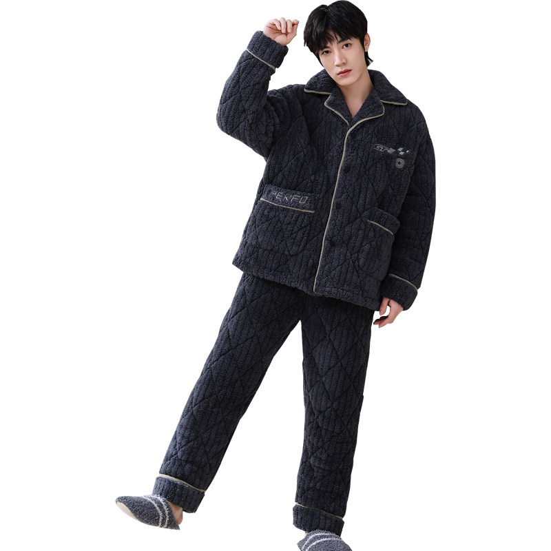 冬季珊瑚绒男士睡衣三层夹棉加厚加绒法兰绒秋冬款家居服保暖套装
