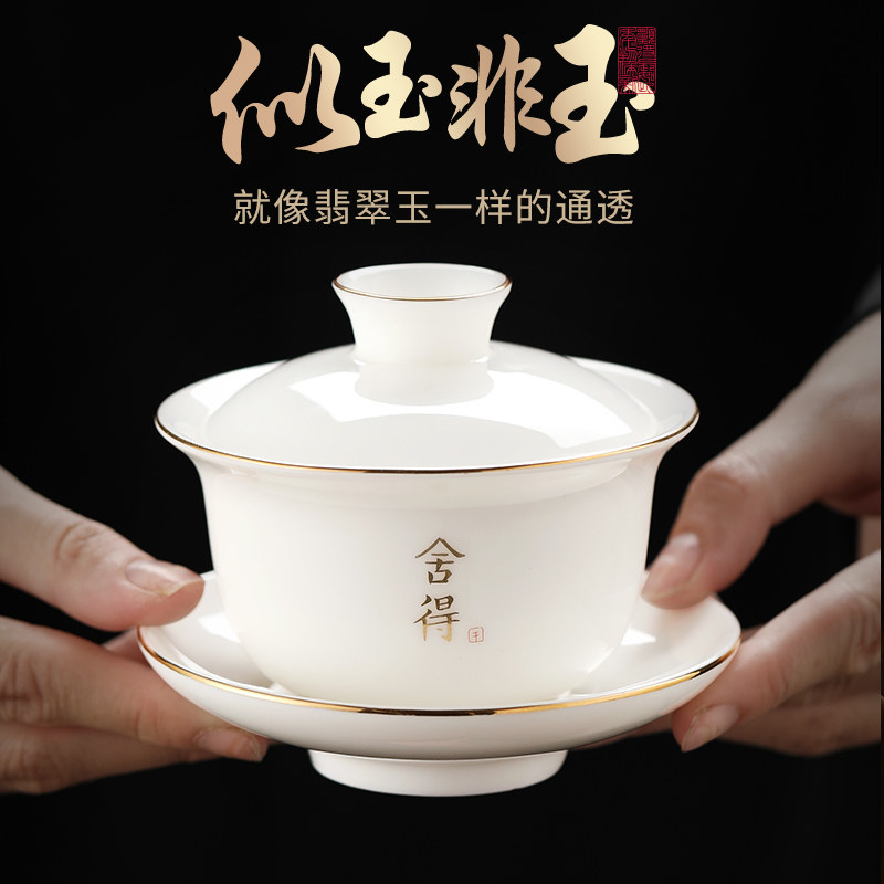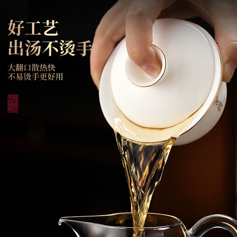羊脂玉瓷盖碗茶杯白瓷泡茶大号悬停茶盖碗家用客厅防烫三件套茶碗