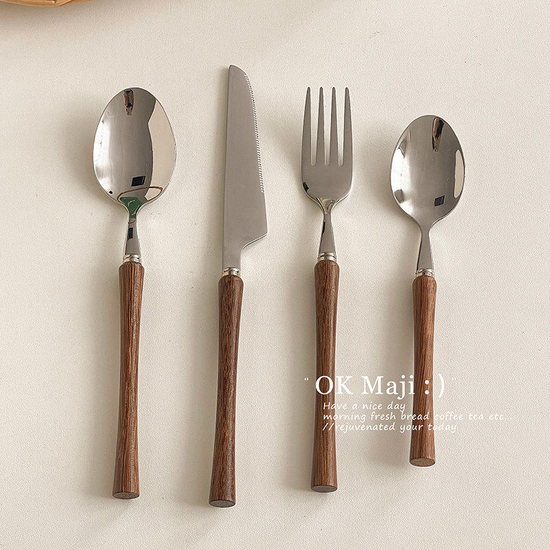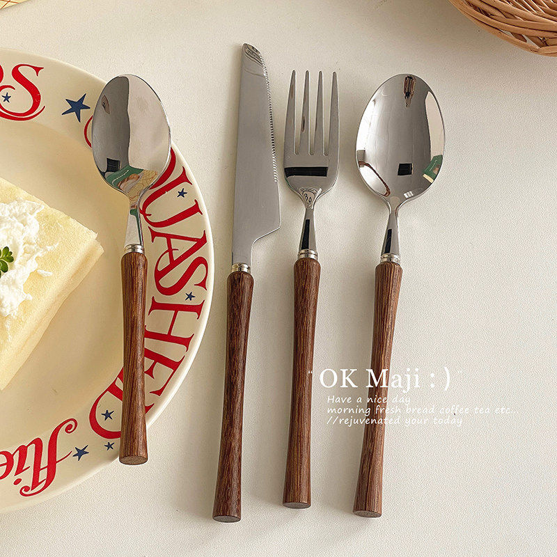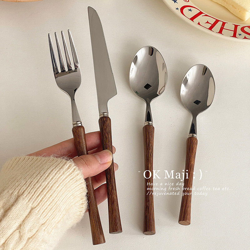 覆古刀叉304不锈钢木质牛排刀叉勺西餐餐具蛋糕甜品勺子叉子套装