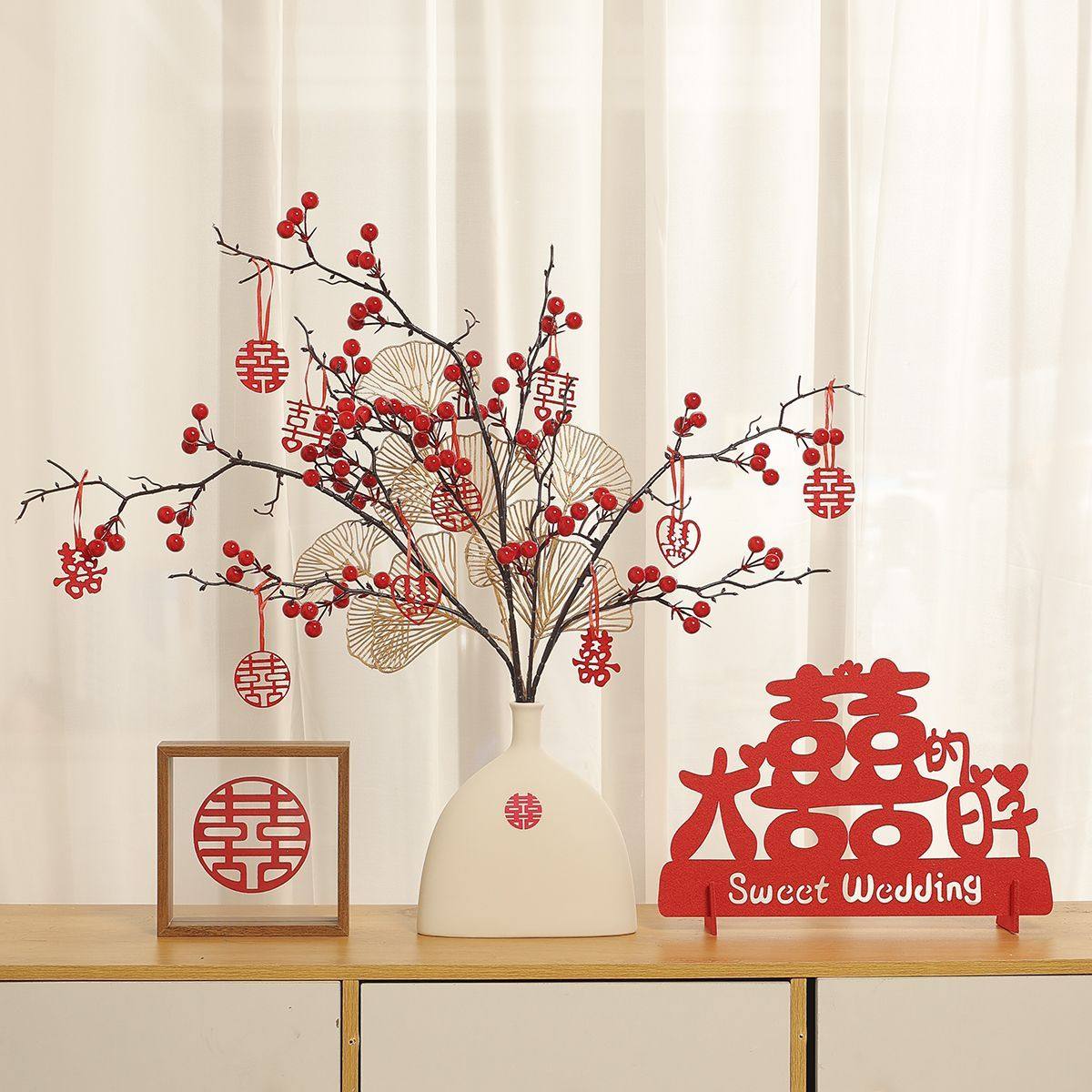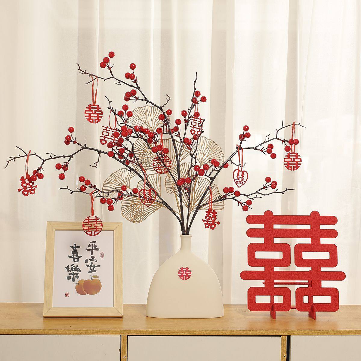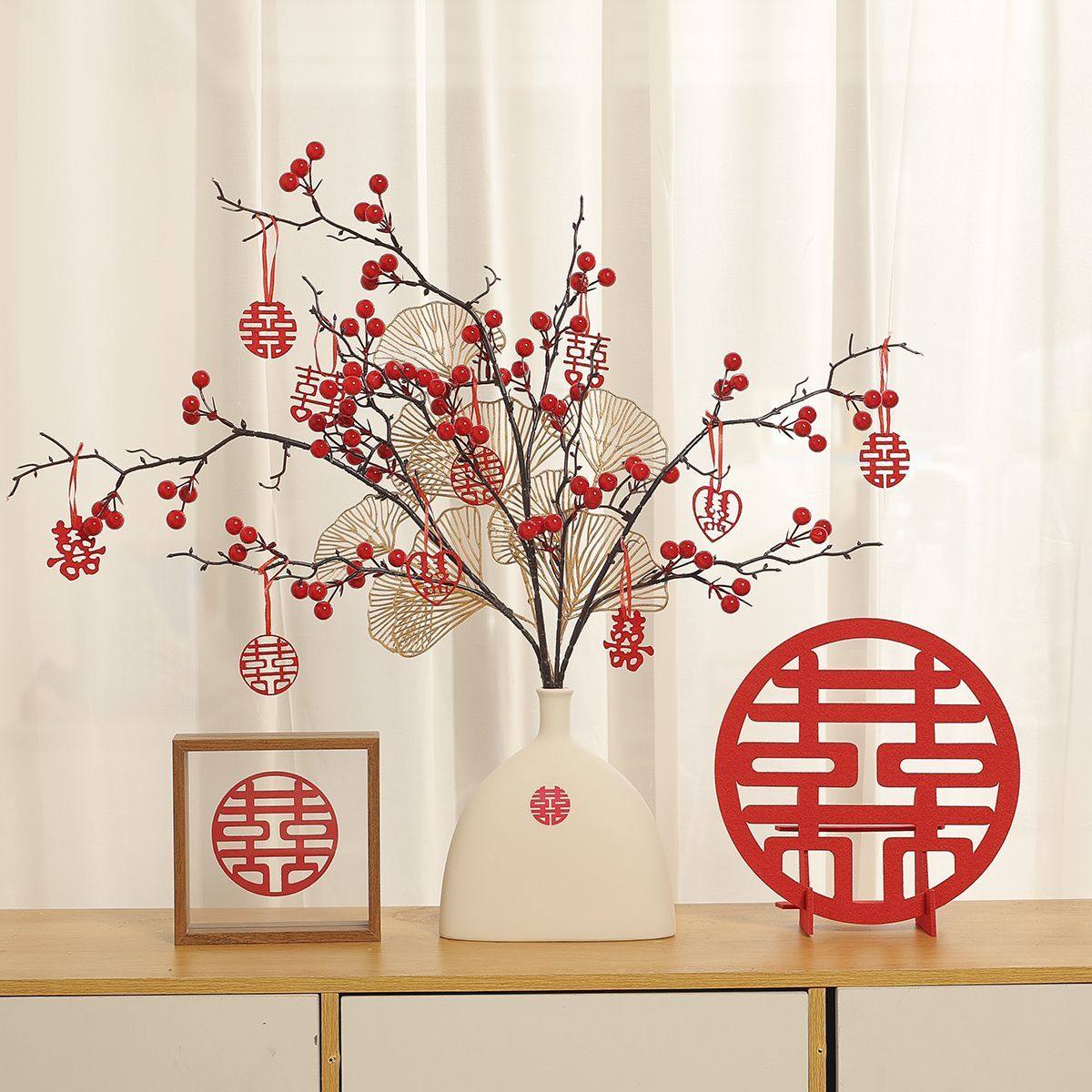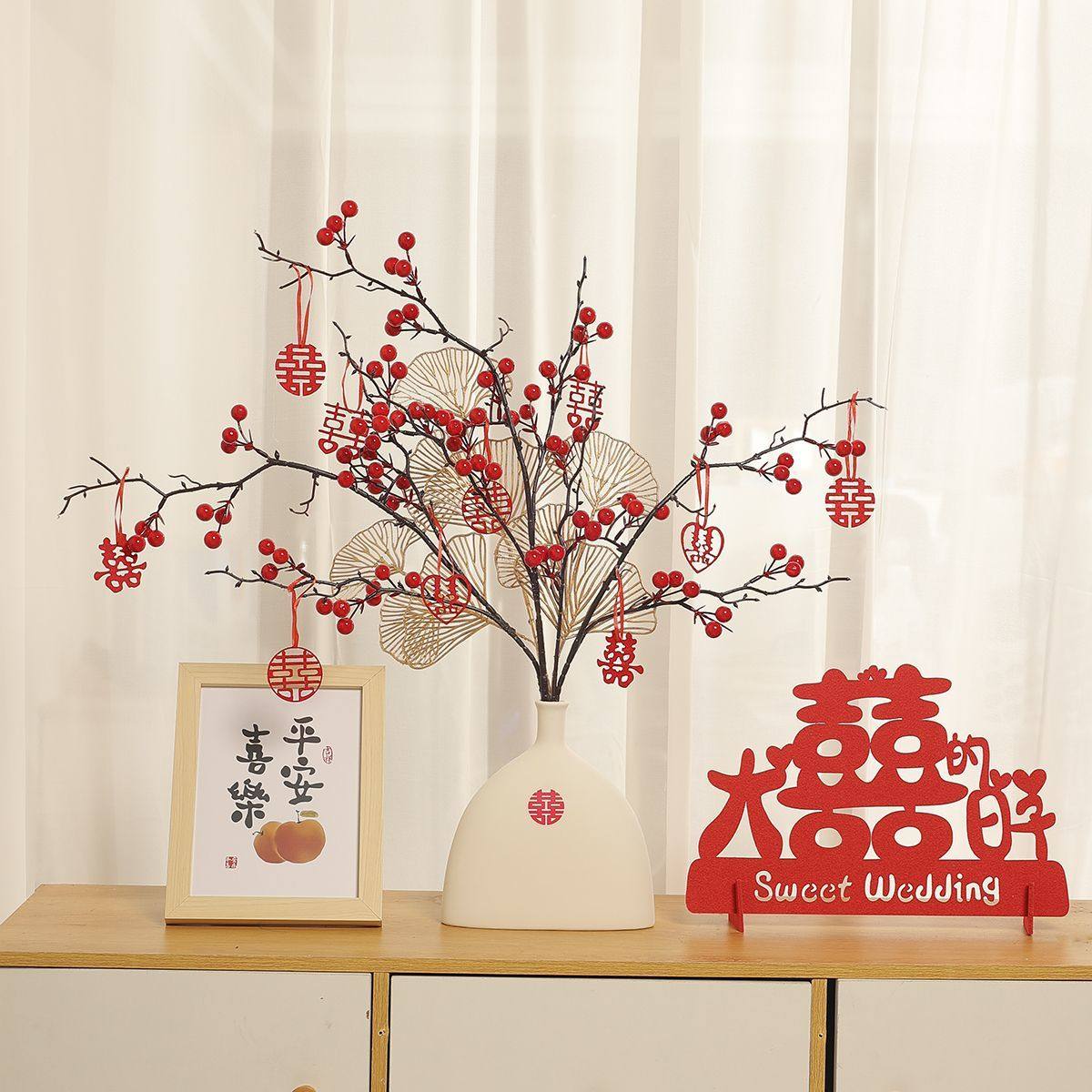 订婚结婚摆件红果发财果仿真花场景布置婚房客厅喜瓶备婚用品大全