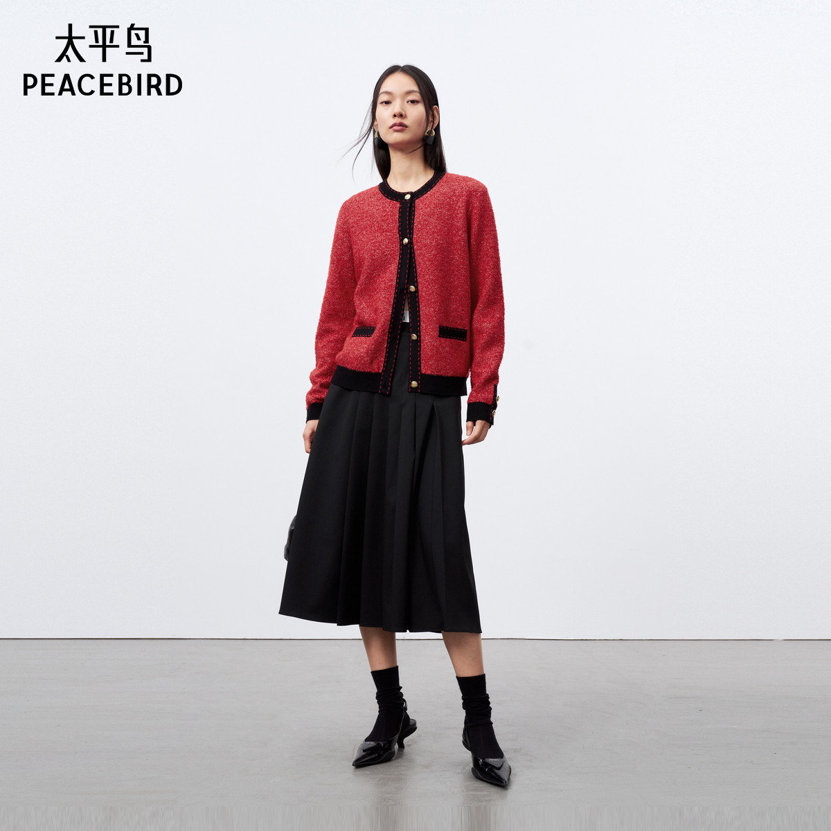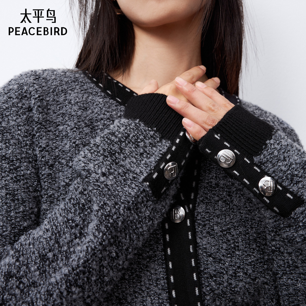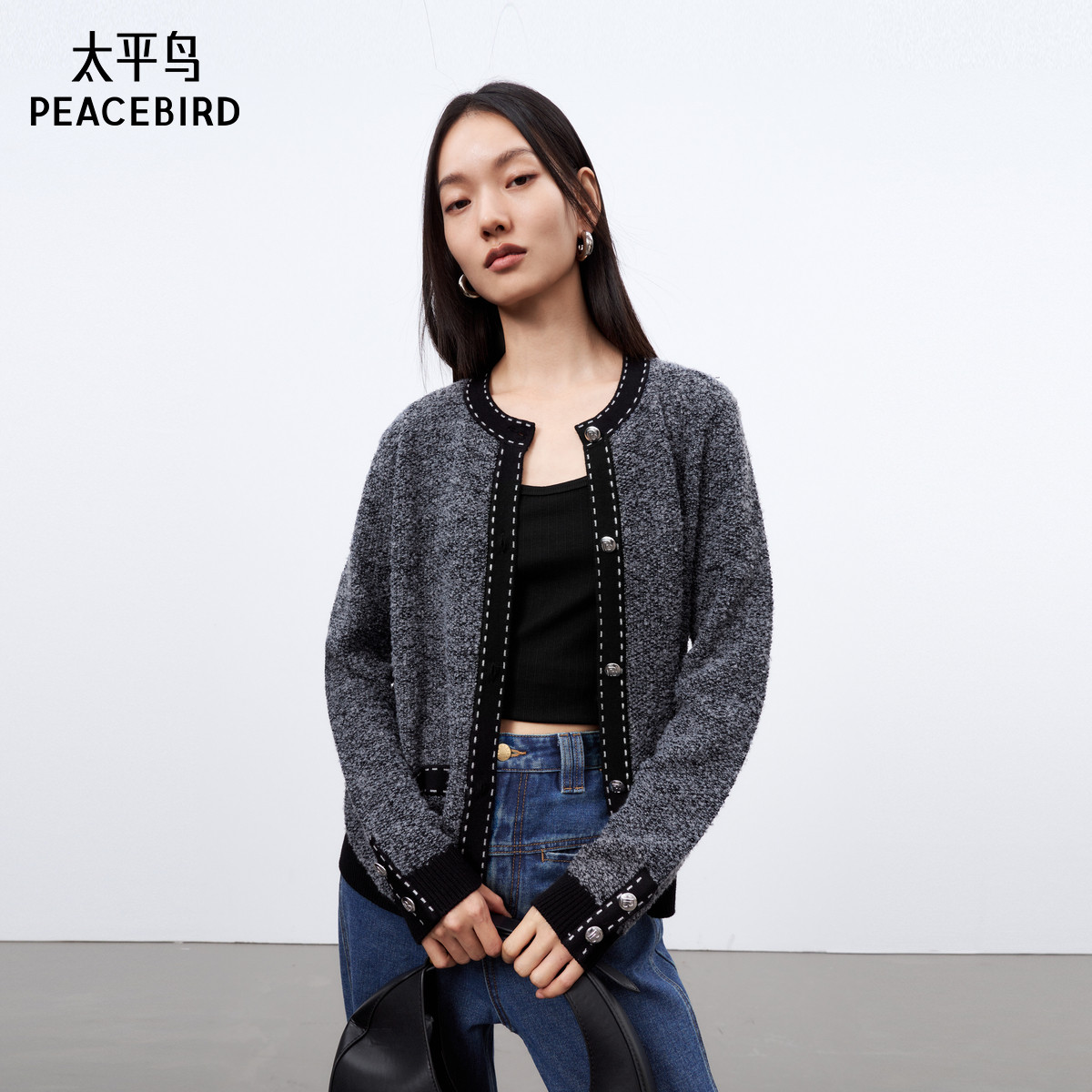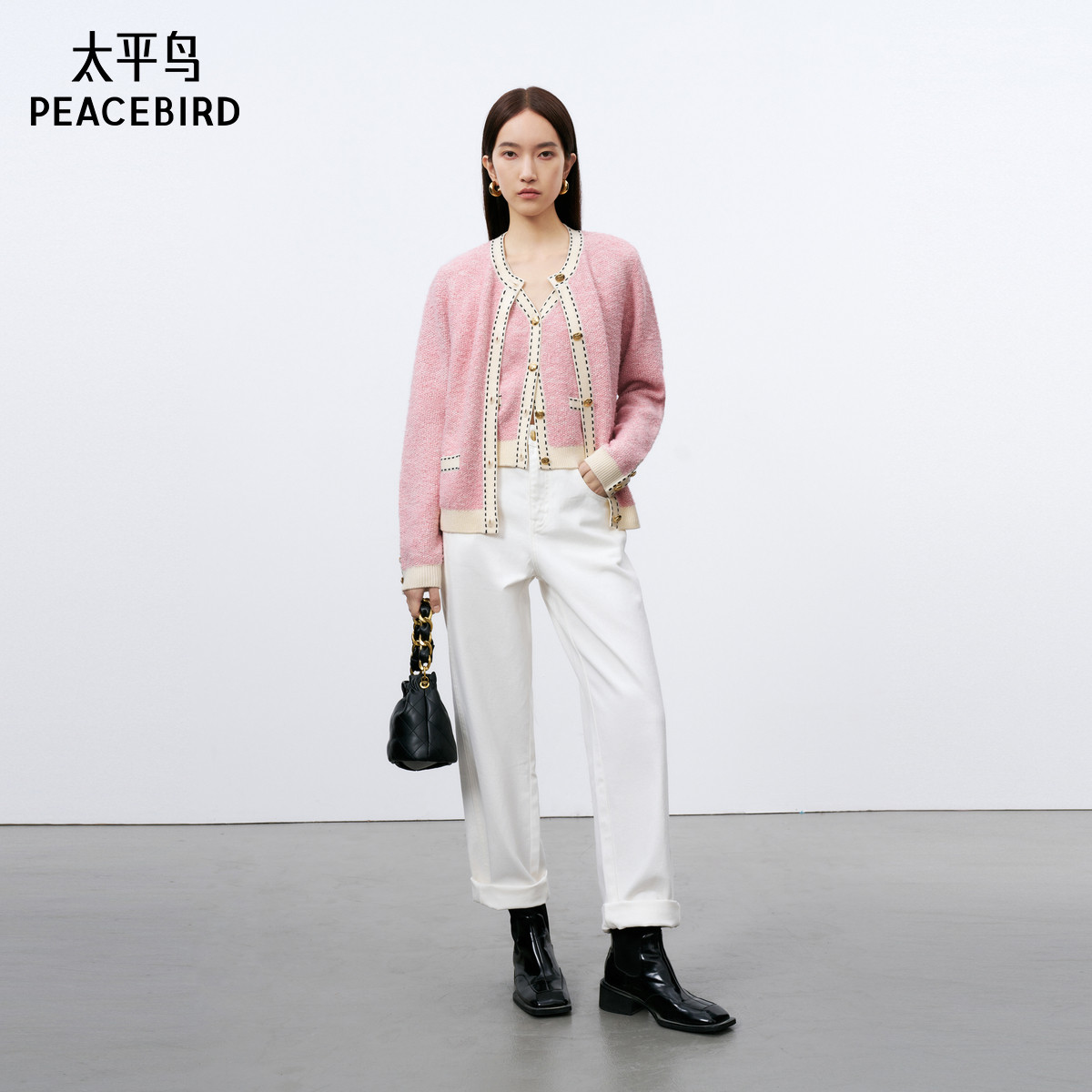 太平鸟粉色气质小香风针织开衫女春装新款撞色开衫背心套装女