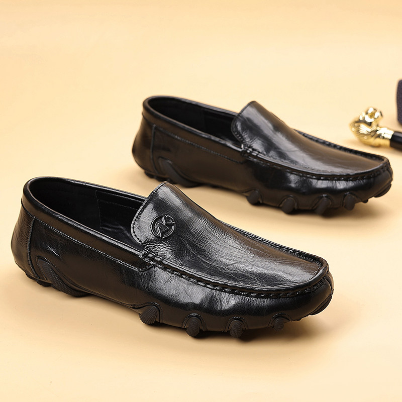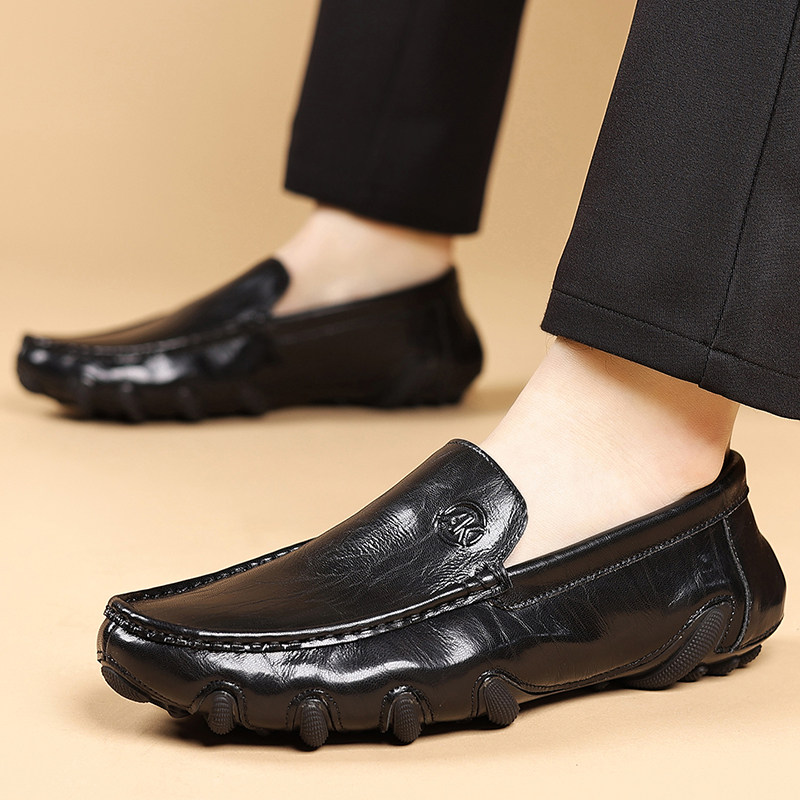新款休闲皮鞋男真皮韩版潮流商务厚底轻质橡胶发泡底一脚蹬乐福鞋