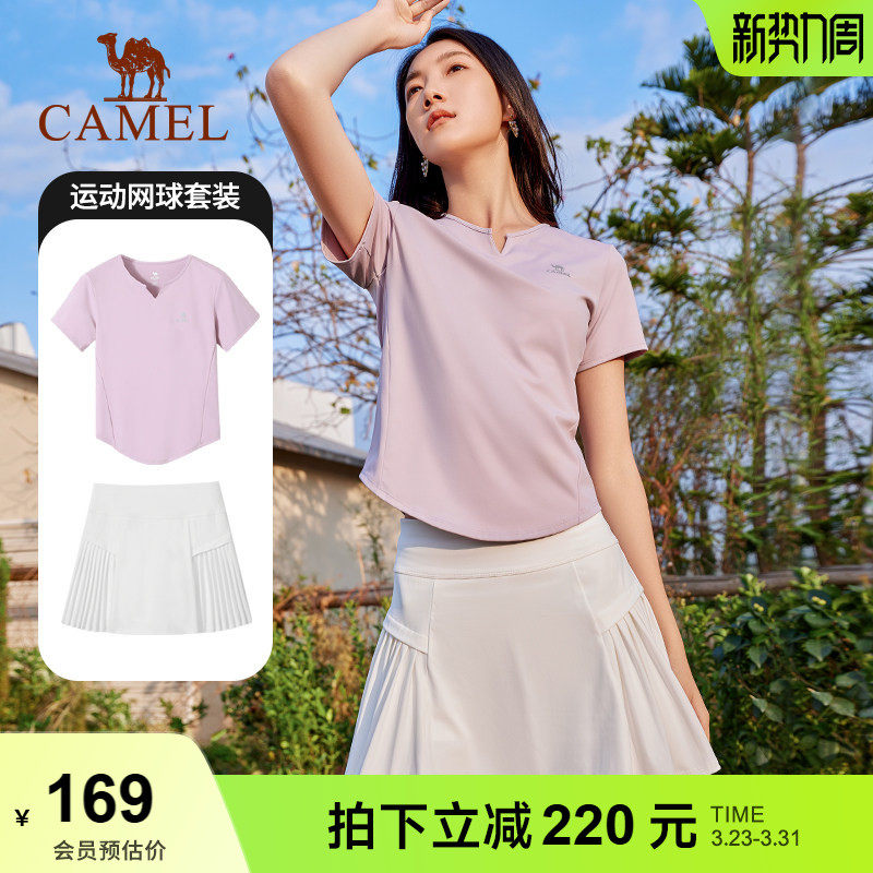 骆驼运动套装2026春夏新款V领短袖T恤搭百褶裙速干透气网球套装女