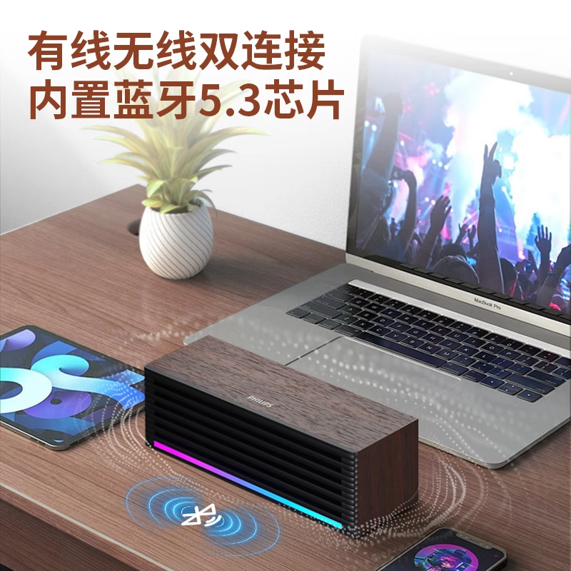 飞利浦SPA3709有线蓝牙双模式内置声卡追剧游戏音箱木质桌面音响
