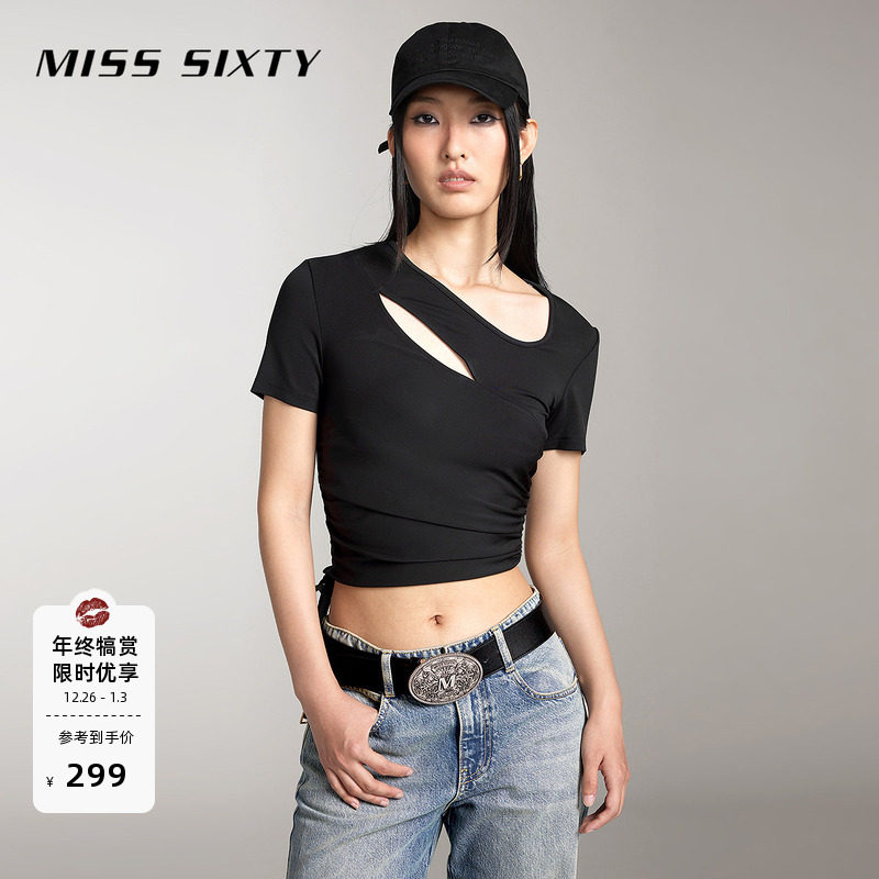 Miss Sixty短袖T恤镂空设计不规则抽褶系带正肩短款上衣通勤