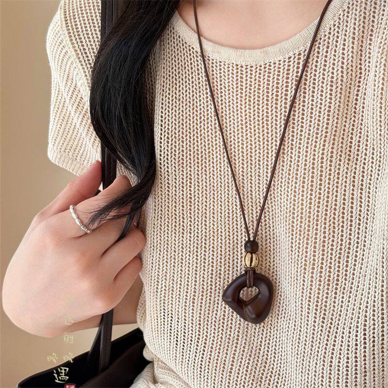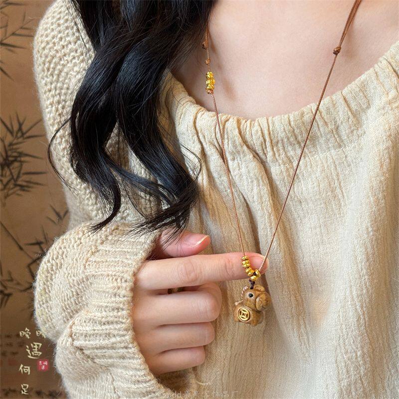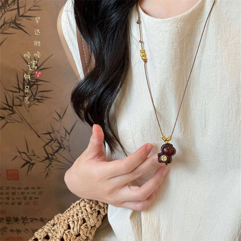 「马上有钱」木质元宝吊坠长款项链女款新中式复古毛衣链挂绳配饰
