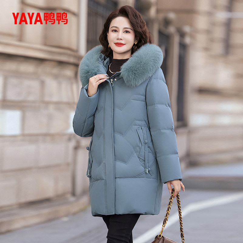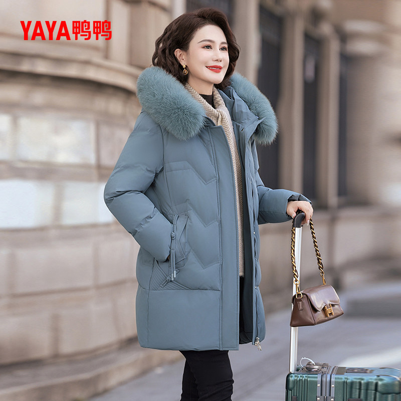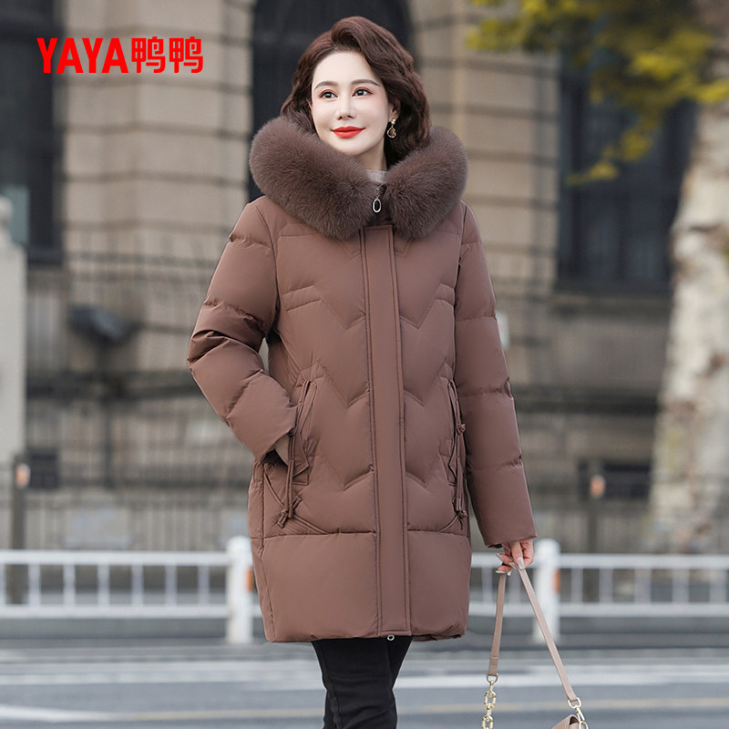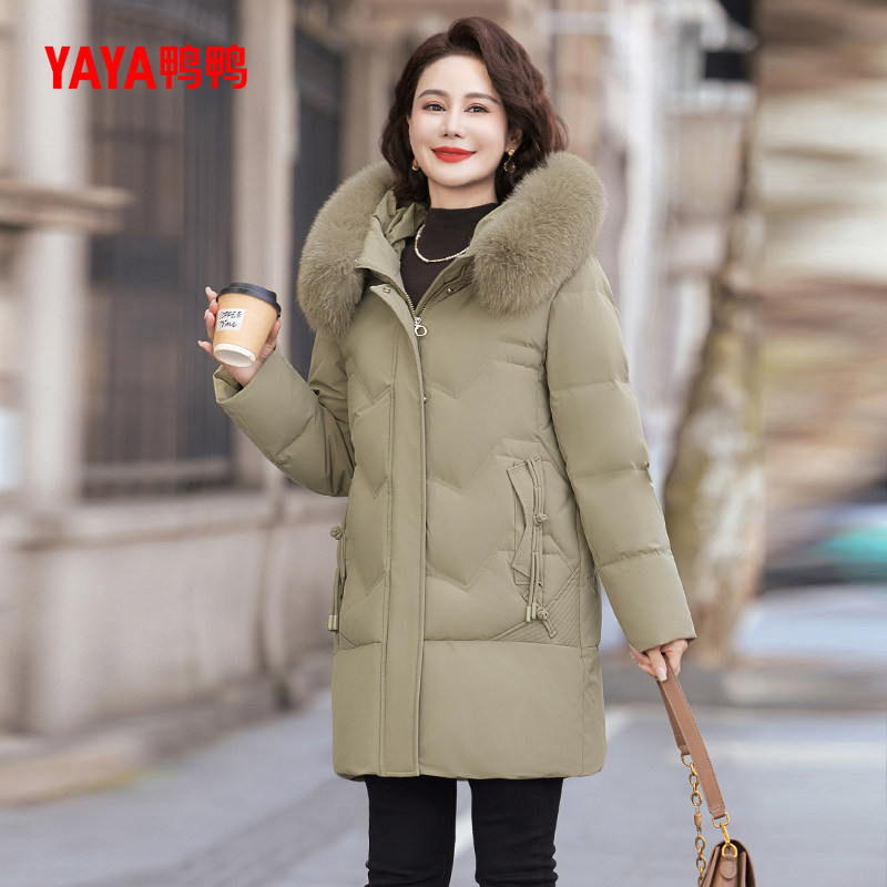 鸭鸭羽绒服女2025冬季新品中老年加厚中长款毛领妈妈装连帽外套S